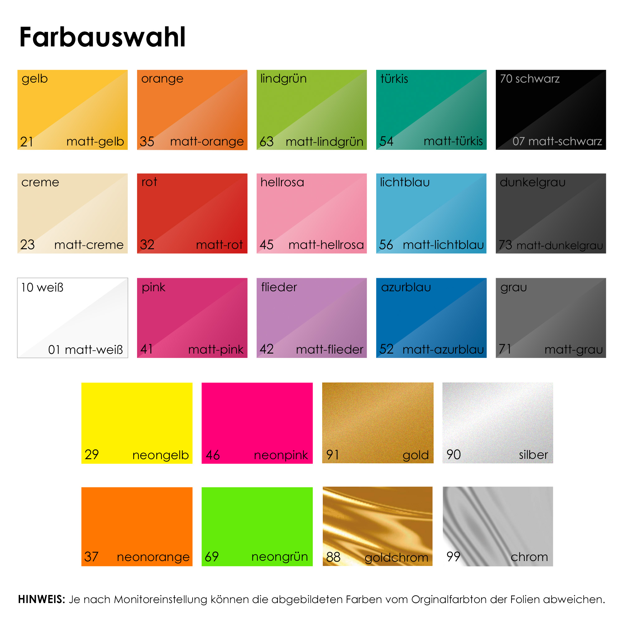 | Farbwahl des Aufklebers | gelb (yellow), azurblau (blue), hellrot (light red), lindgrün (light green), schwarz (black), silber (silver), gold, pink, pastellorgange (organge), weiß (white) | ||