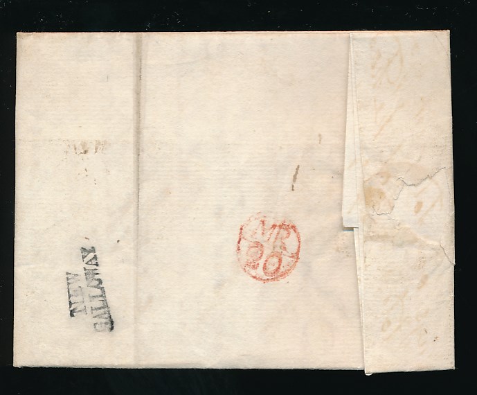 Cover with entire clear and clean letter from Sam Clark to Falkirk; New Galloway 2 line name stamp in black + Mar 20 bishop mark in red on the back.