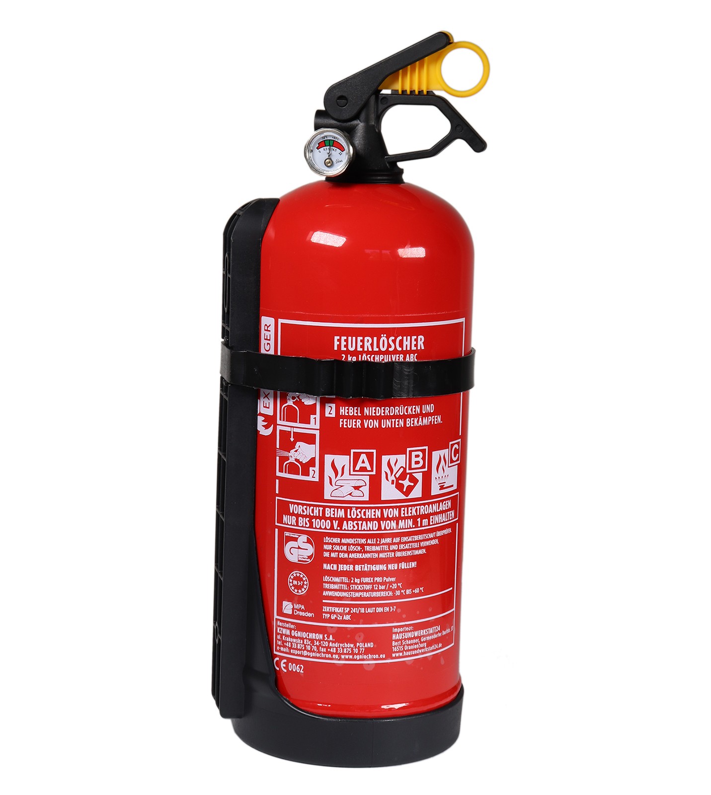 Der 2 kg Feuerlöscher ist speziell für den Gebrauch in Transportern und LKW`s. Er gehört zu den Dauerdrucklöscher und besitzt zur Kontrolle ein Manometer. Dauerdrucklöscher können bis zu 20 Jahre verwendet werden. Die zweijährige Prüfung der Einsatzbereitschaft durch einen Fachmann sollte trotzalledem durchgeführt werden. Einfache Handhabung und schnelle Einsatzbereitschaft zeichnen ihn aus. Mit seiner Größe von nur 41,0 cm nimmt der Feuerlöscher wenig Platz weg und läßt sich problemlos verstauen. Mit der mitgelieferten Halterung läßt er sich problemlos anhängen. Der GP-2X wurde in Europa hergestellt und unterliegt der Europäischen Norm DIN EN3-7.