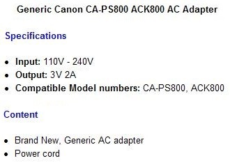 Canon PowerShot A570 A580 A590 A710 A720 SX100 IS Digital Camera power cord Store Inventory Reference Number: AQY-AAADM-6353Store Shipping Code: PACK-958