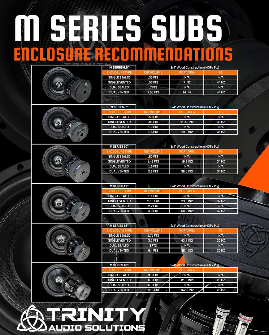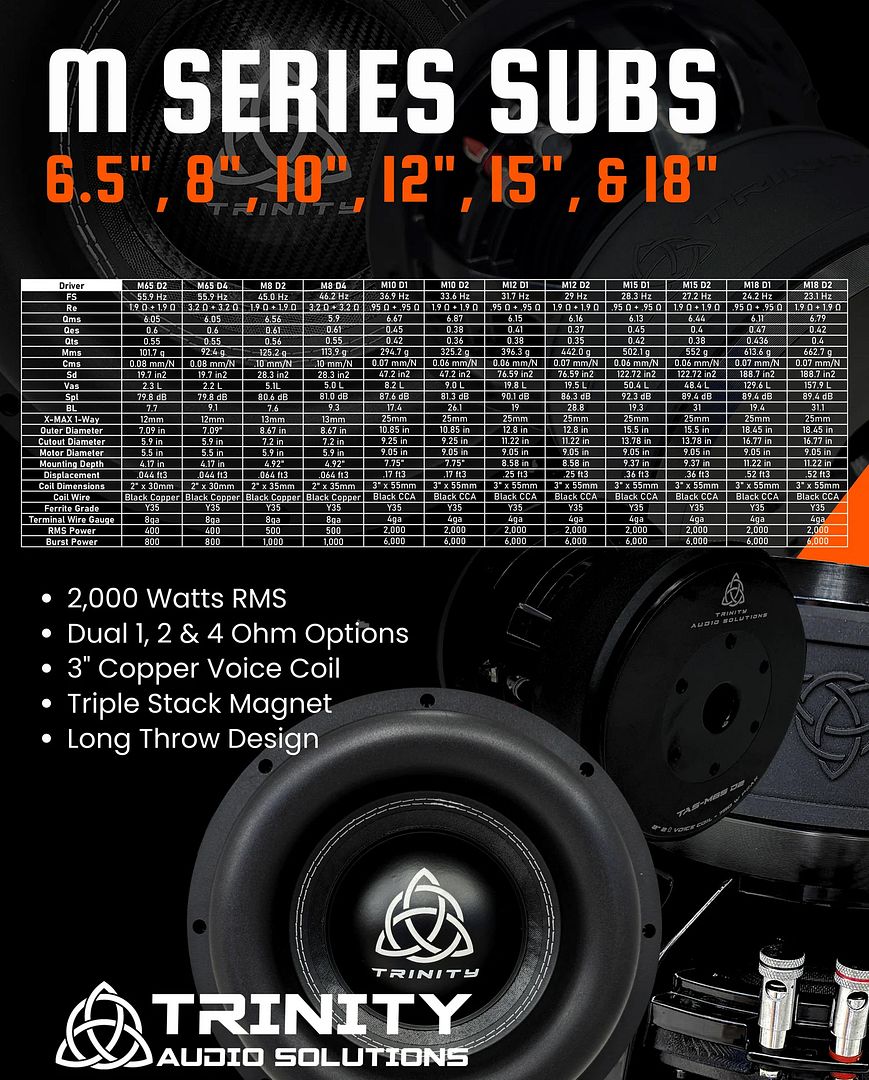 The Trinity Audio Solutions M Series is the perfect subwoofer for the bass head who values clean, tight bass that doesn't sacrifice performance or clarity. The M Series Subwoofers feature high quality cast aluminum high excursion baskets with an optimized air flow design, triple stacked high density ferrite magnets, SPL rated composite paper cones, soft compliance triple layer stretch foam surrounds and a progressive roll spider pack. This combination of features allow a level of performance never seen in this price range.