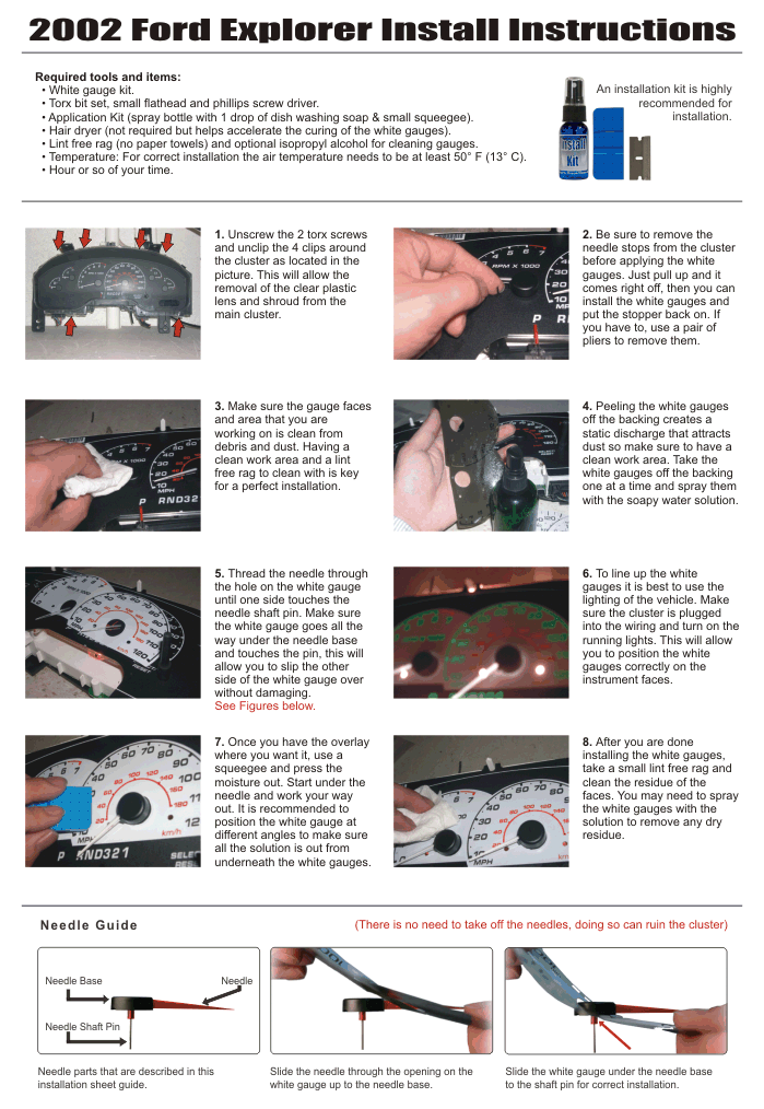 Our white gauges are an overlay style and install over your factory OEM gauges. They are manufactured this way to allow an easier installation without needle removal, re-wiring or without voiding your vehicle warranty. Application of the white gauges is comparable to the process of tinting windows, we highly recommend our gauge face installation kit for an error free install.