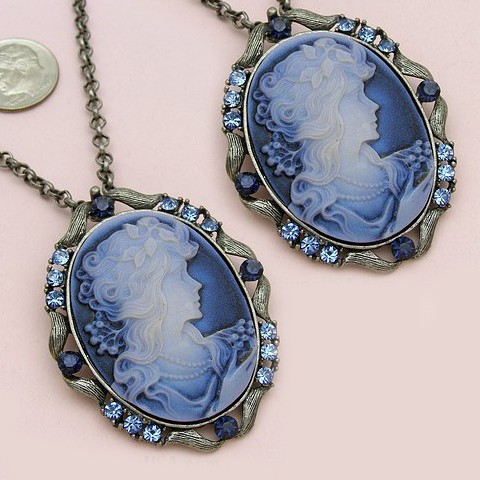 Title: Antique VTG Style Brass Blue Rhinestone Designer Cameo Necklace Chain Pendant 1b