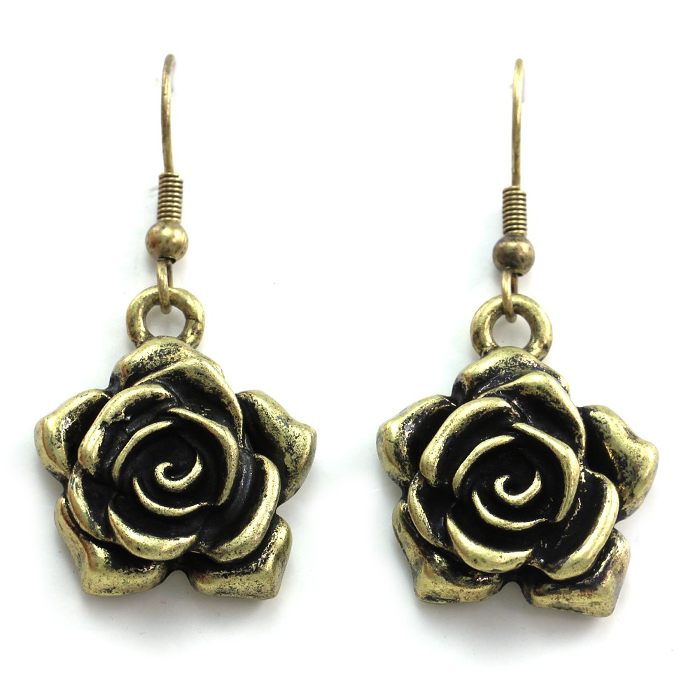 Title: Antique Style Rose Flower Dangle Earrings Brass Bronze Tone Fashion Jewelry a1