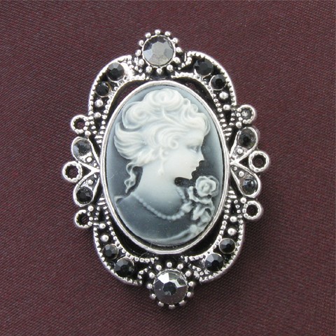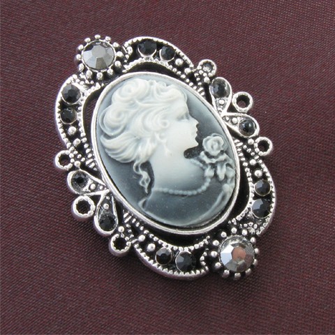 Title: Medium Gray Cameo Brooch Pin Charm Antique Silver Tone Black Stone Oval Charm j1