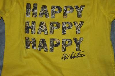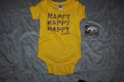 Features and Benefits- Made of 100% cotton for comfortable wear- Snap closure- Short sleeves- Camo-filled "happy happy happy" graphic on the front