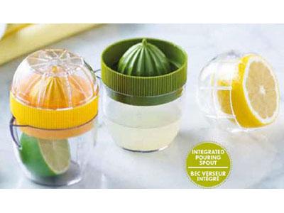 It is easier than ever to juice your lemons and limes when you have the Mini Citrus Juicer. This juicer has a lid that grips lemon or lime halves easily. The juicer section sits atop a bottom cup that catches all of the citrus juice and features a built in pouring spout. The Mini Citrus Juicer can also be used to hold extra juice or fruit sections for future use. Never again hurt your hands by trying to squeeze the last drop out of a lemon or lime. Holds up to 1/2 cup of fresh squeezed juice.