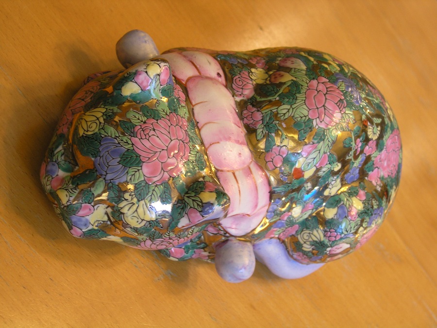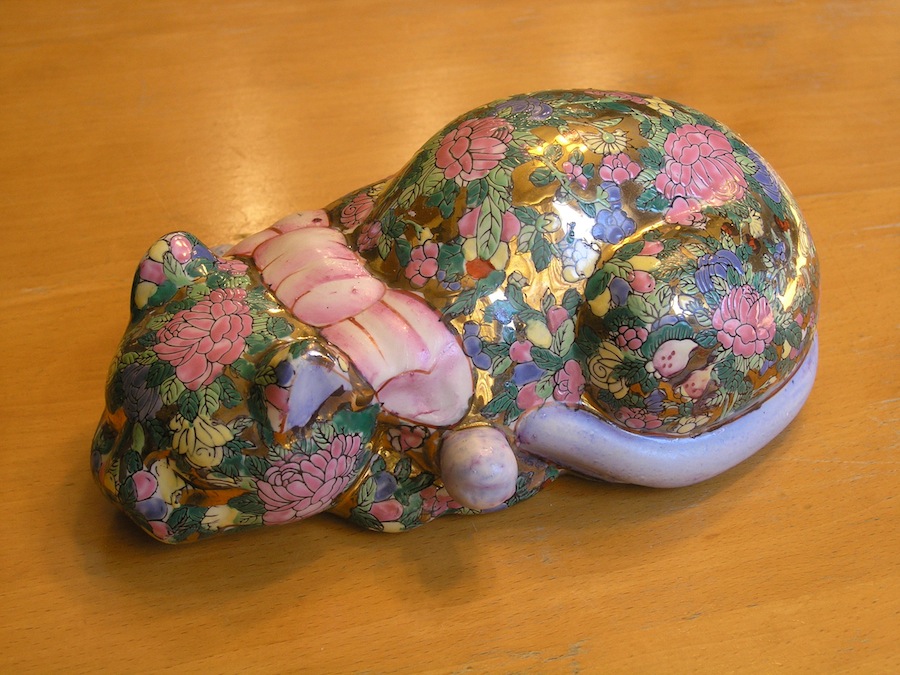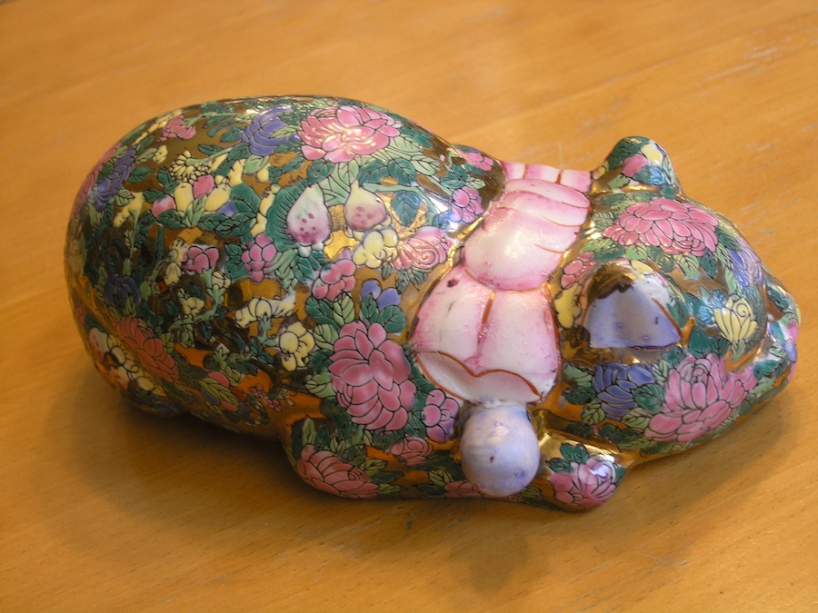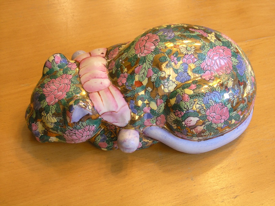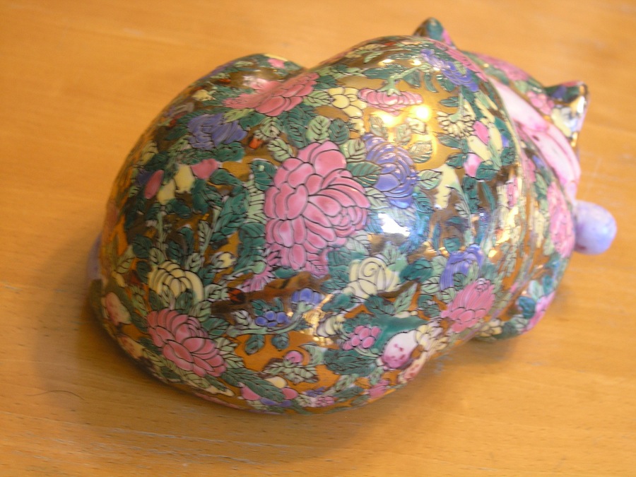 This listing is for a Vintage Sleeping / Reclining / Lucky Cat Large Porcelain Figure / Figurine with a Floral Chintz / Rose Medallion Style hand painted in Enamel and other paint and gilded throughout.