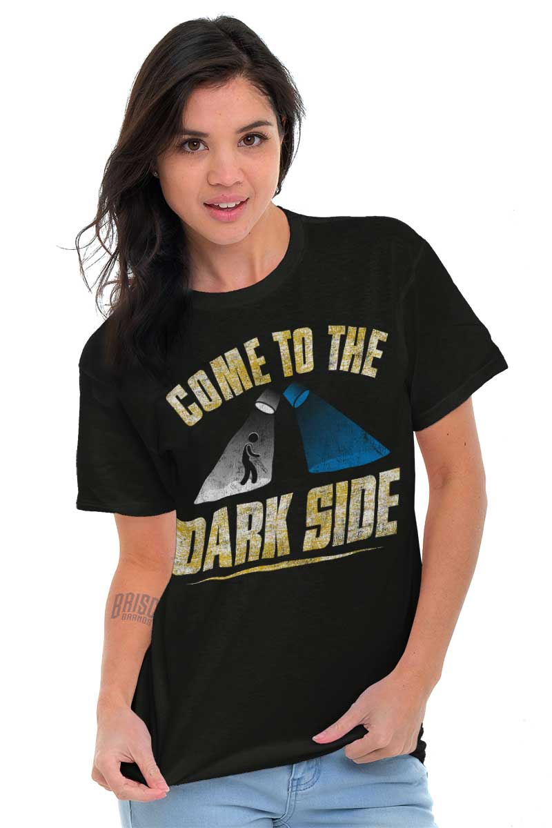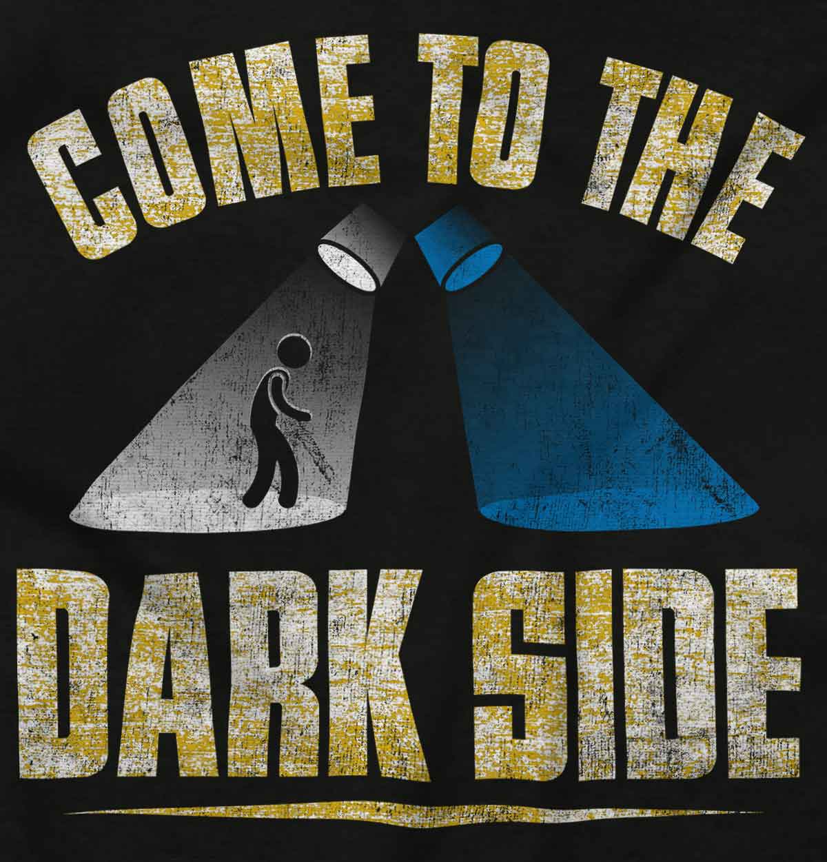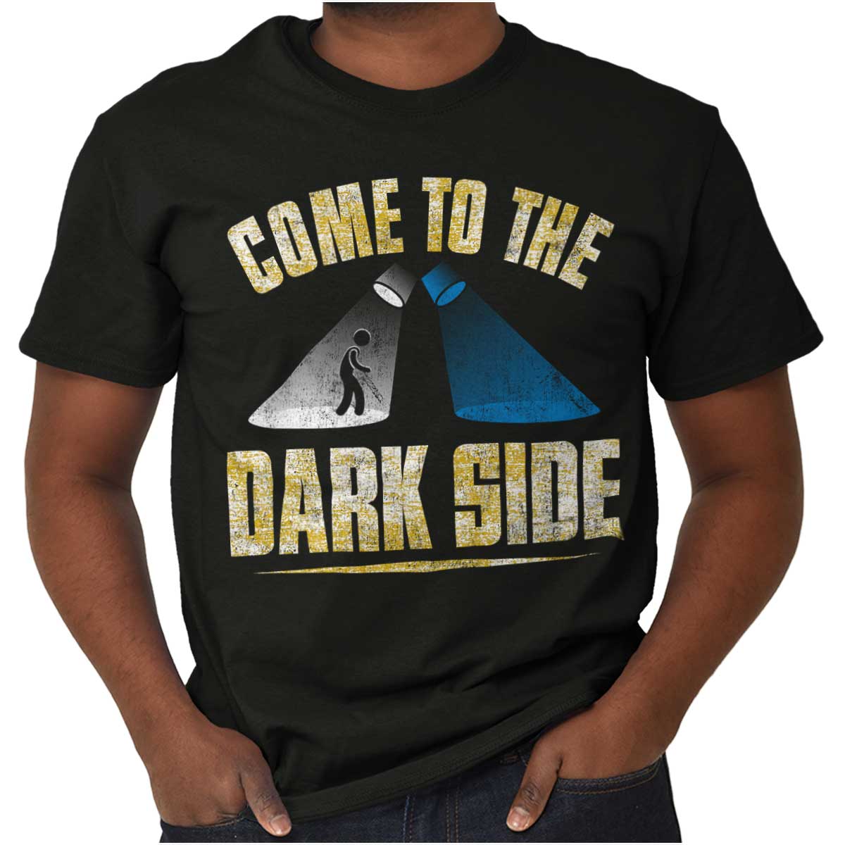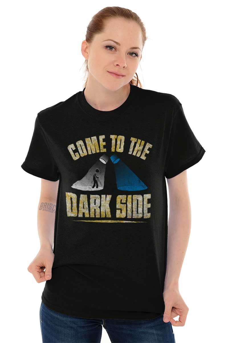 Light is boring. All you do is see clearly and how everything is suppose to be colored and such. Whatever the dark side is cool and makes everything have cool tone to it. Light hurts your eyes anyway, and the dark side you don't have any glare. Show people that the dark side is so much better than the light with this T Shirt. It is time to choose your role in the ever changing battle against light and dark. The dark side is better than the light and you never need to change any light bulbs either, because it is already dark.