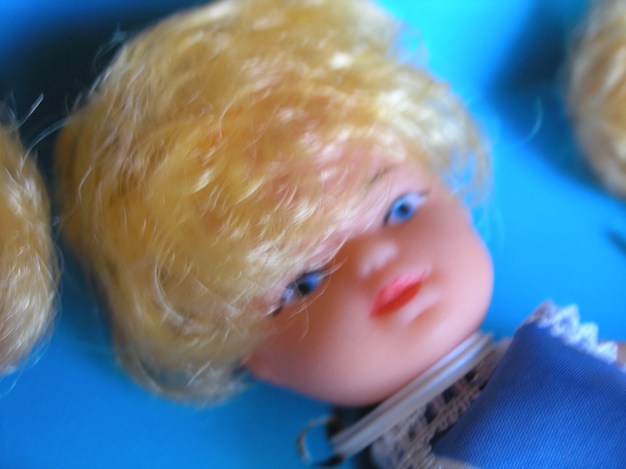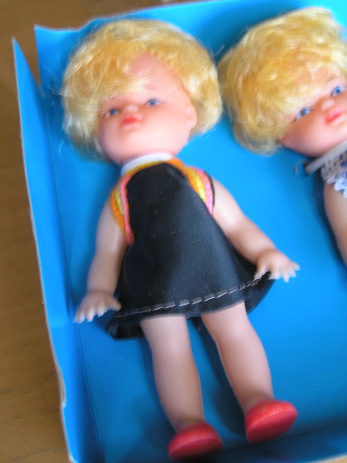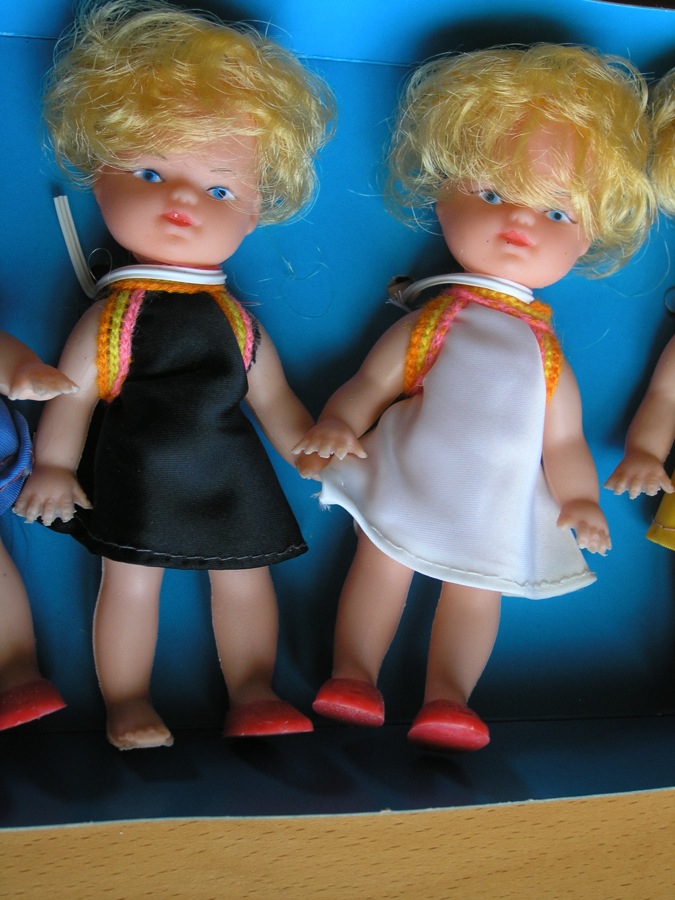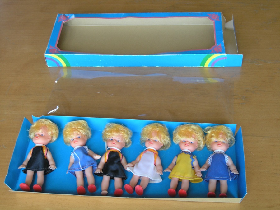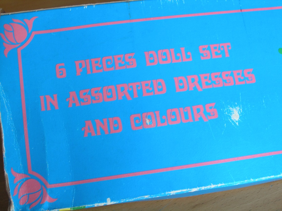 This listing is for a Group of 6 Hard Plastic Dolls In Assorted Dresses and Colors, measuring 5 1/4 inches in height , in one box as shown