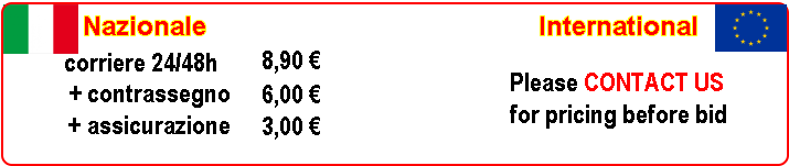 Le spese di spedizione comprendono i costi di imballo, e sono a carico dell'acquirente, con pagamento anticipato; la spedizione sarà effettuata entro 48 ore dalla ricezione del pagamento. L'oggetto verrà imballato in modo adeguato per il tipo di spedizione scelto: non si assume nessuna responsabilità per eventuali danni causati dal trasporto; verificare quindi l'integrità del pacco e del contenuto non appena lo si riceve, ed utilizzare l'opzione "assicurazione" per oggetti costosi.