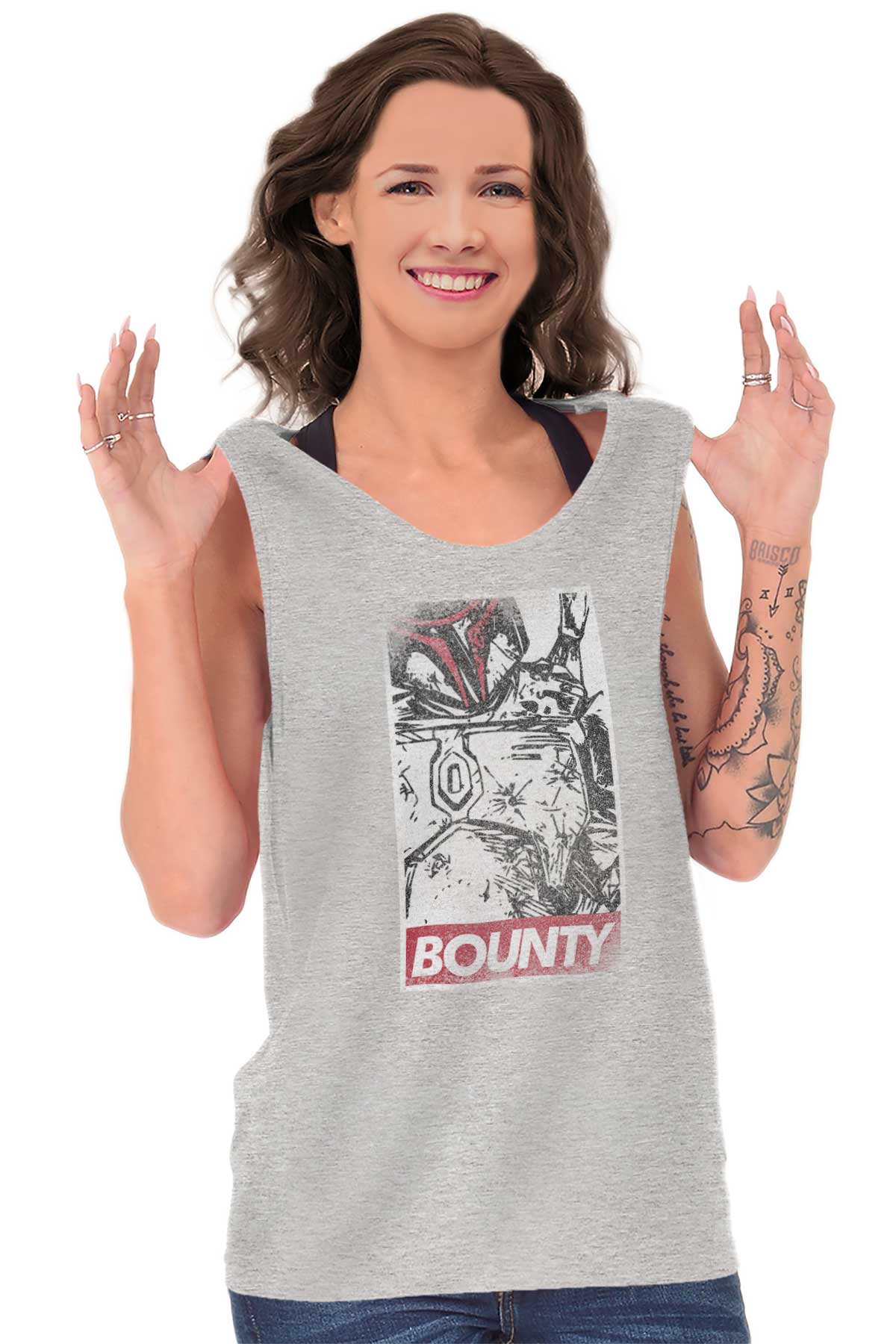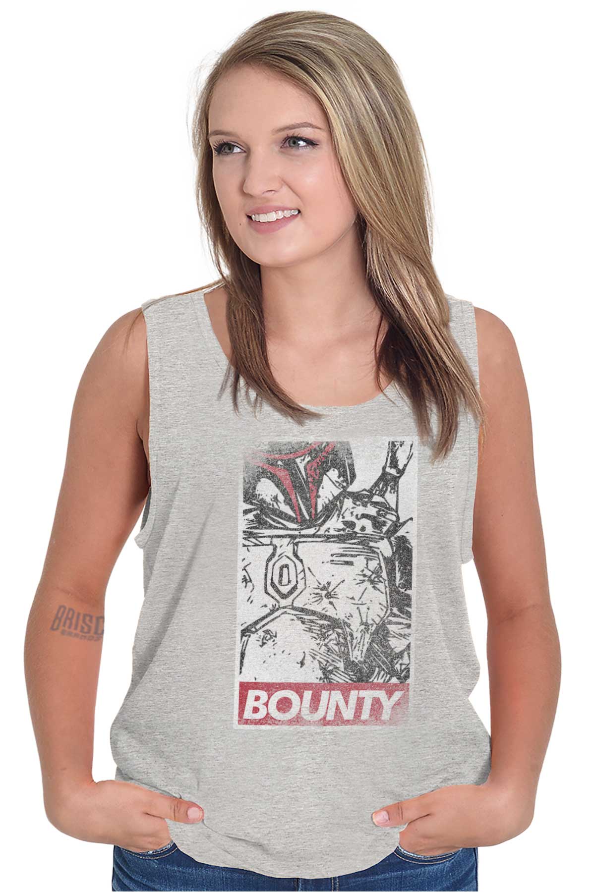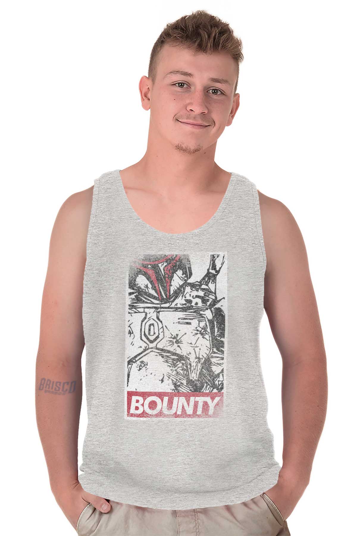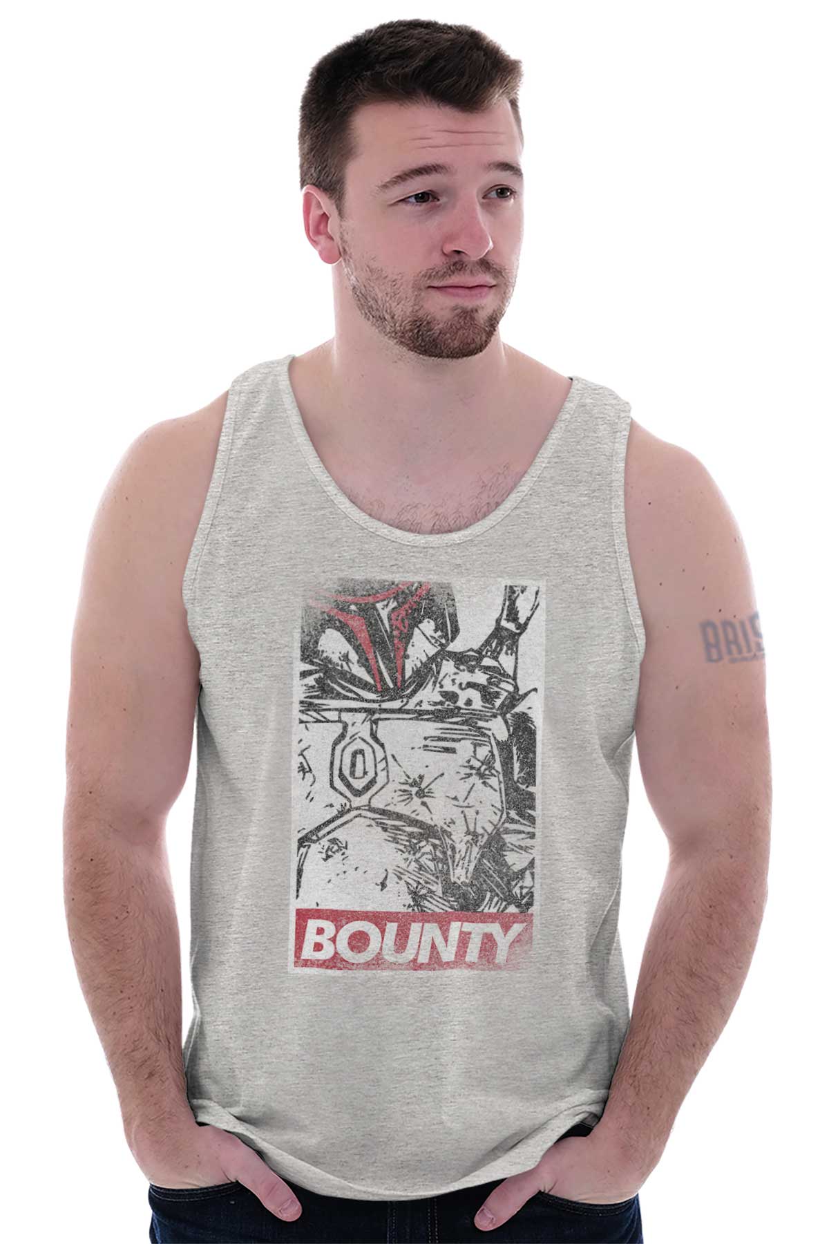 This Tank Top is inspired by classic vigilante street art. Times have changed. There needs to be a new ideal and icon to celebrate. From one to another BOUNTY: this Tank Top honors the most feared bounty hunter our galaxy has ever seen!