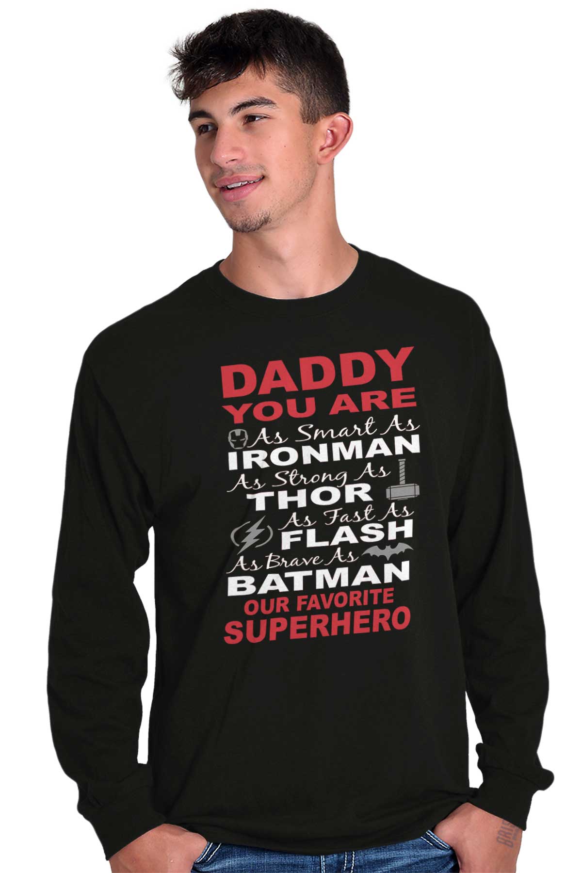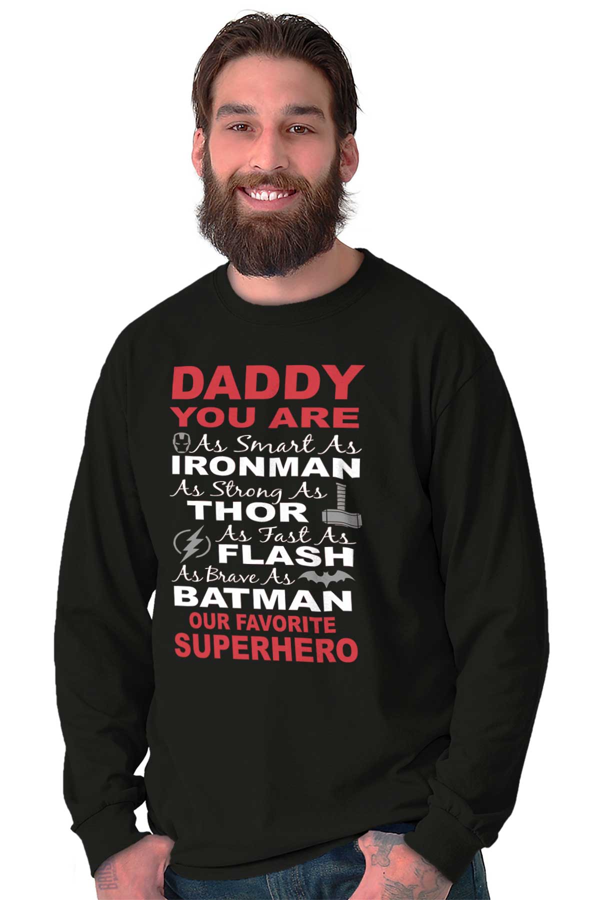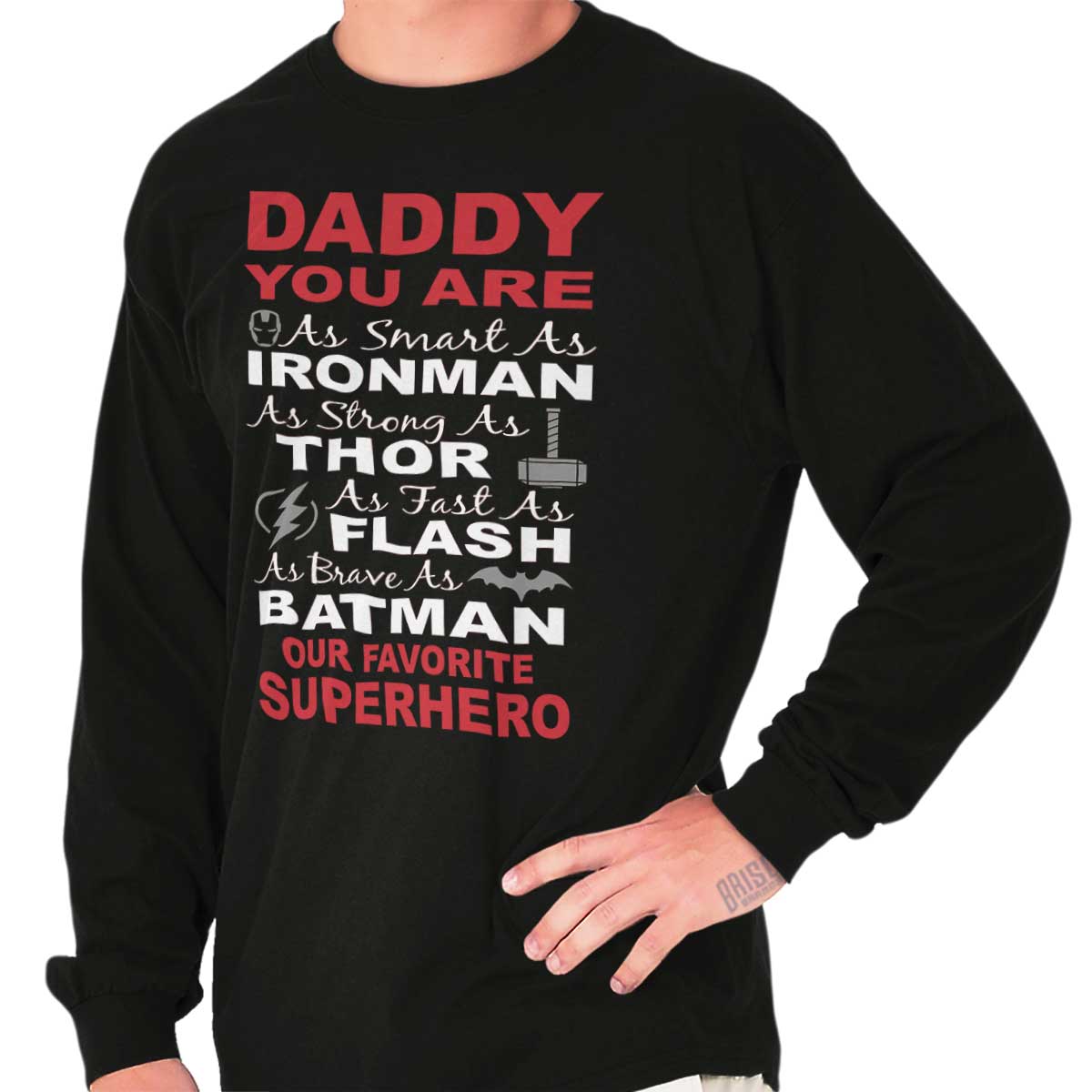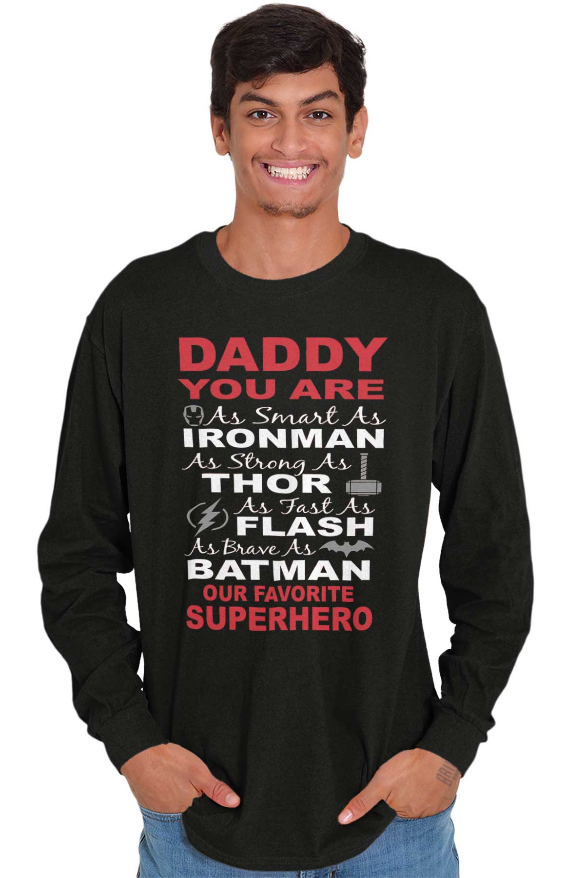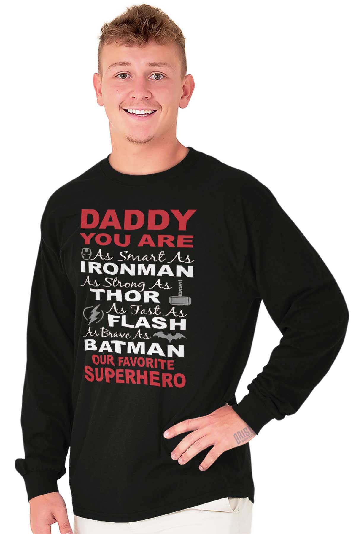 It's a bird! It's a plane! It's your dad? That's right. This Long Sleeve T Shirt is the perfect way to say thank you to the greatest hero of all: your old man. Say thank you for all those sleepless nights you caused him or that little accident you had earlier. If he's a fan of the comics or the movies, he'll love this superhero piece. Show him that he's as much of a hero as the Iron hero when he feeds you and puts bandages over your boo boo's. It's your dad afterall, the hero you may not deserve, but the one you need and love.