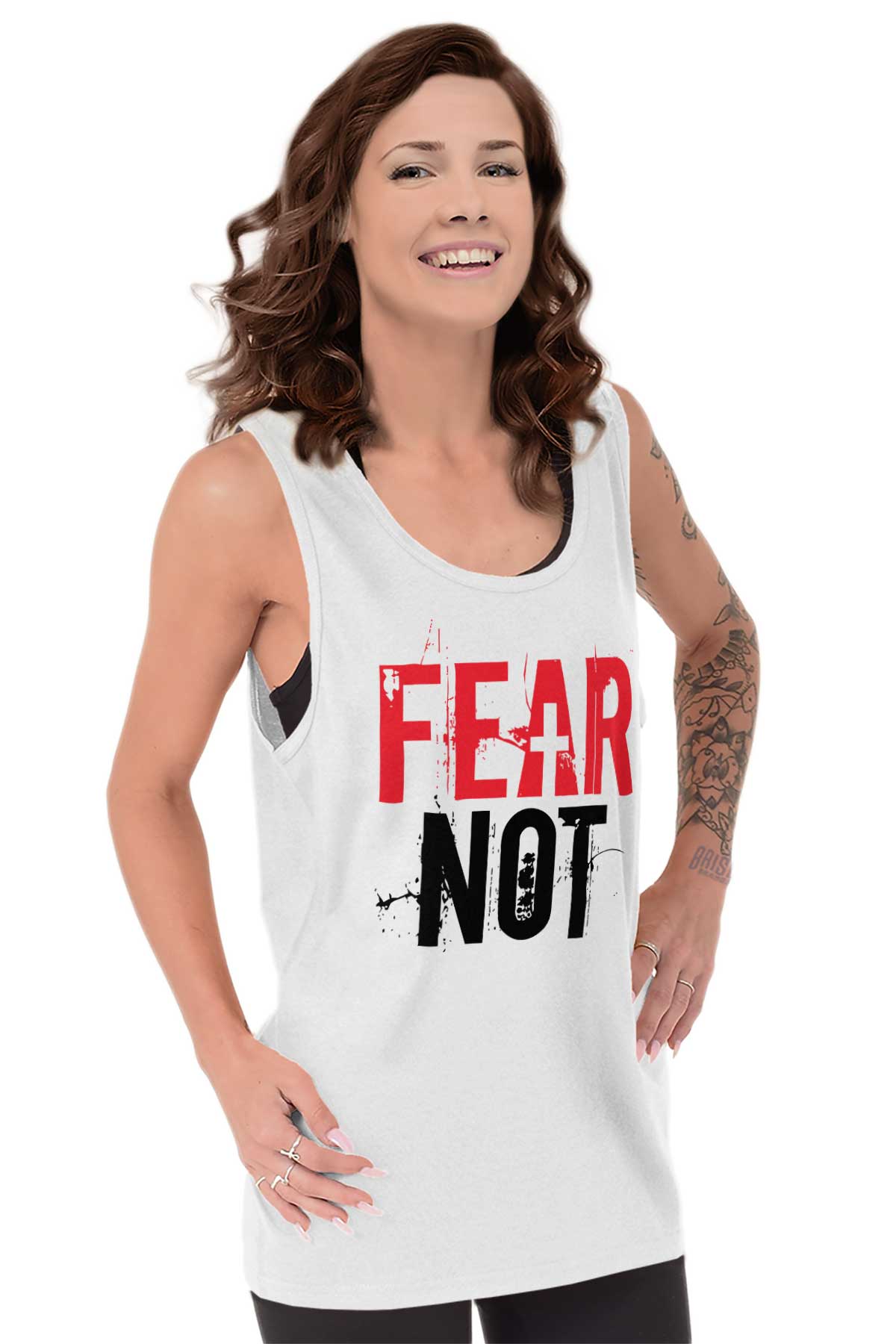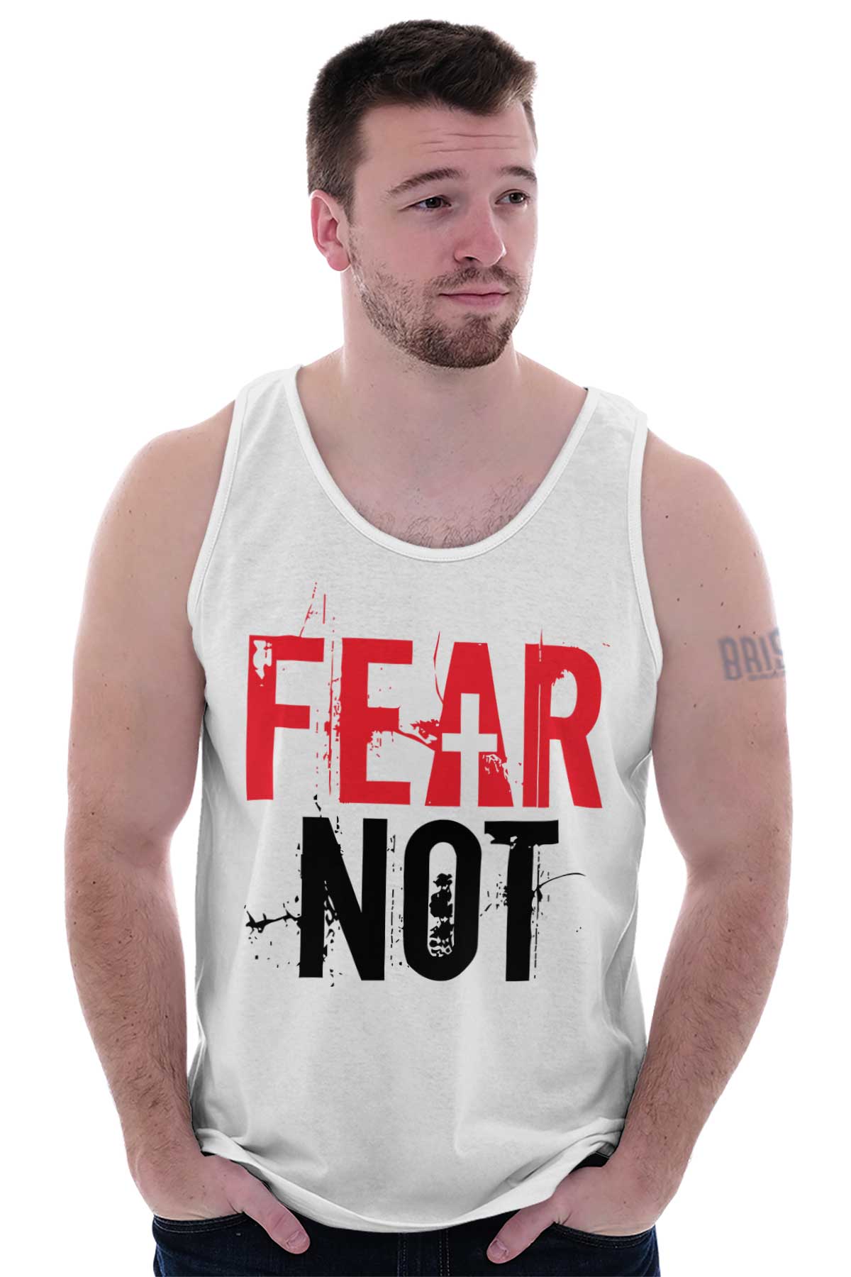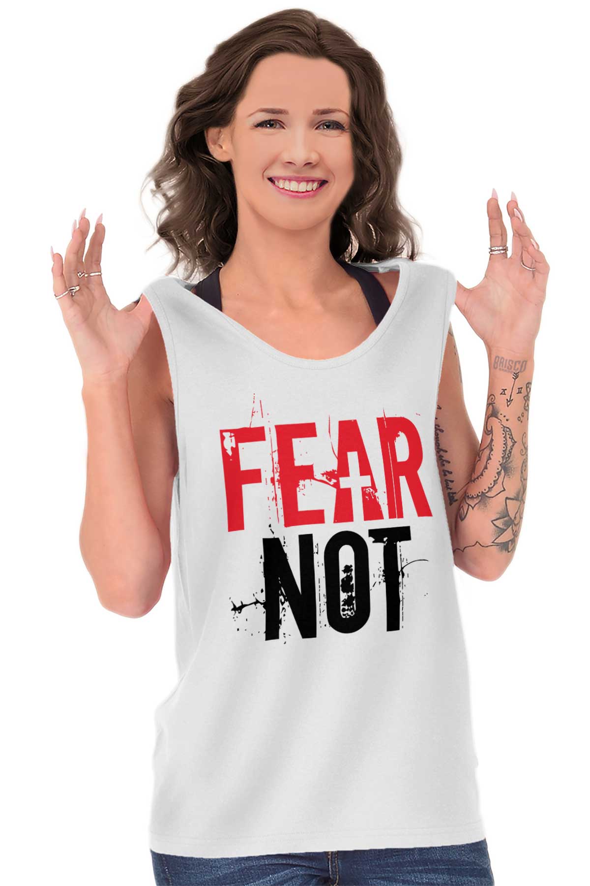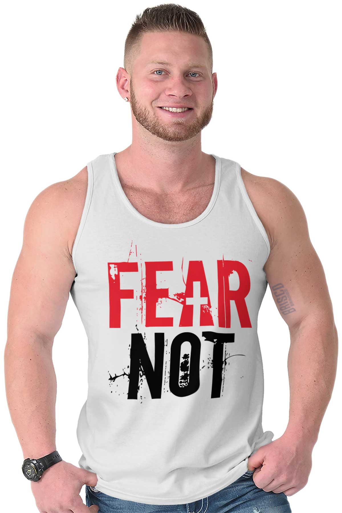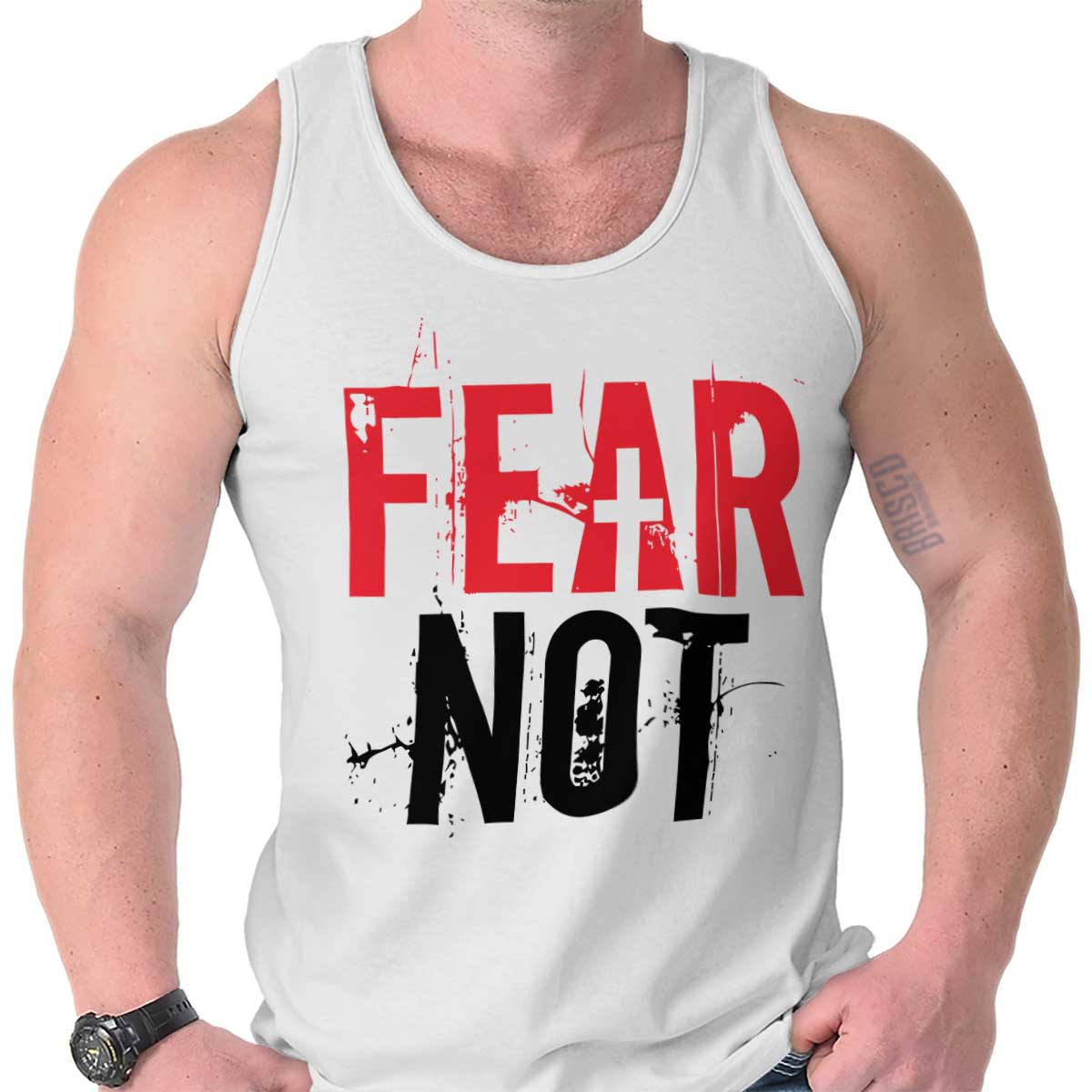 Say to those with fearful hearts, “Be strong, do not fear; your God will come, he will come with vengeance; with divine retribution he will come to save you.” Isaiah 35:4. There is nothing so difficult or scary that we should back down and not try. God is on our side and always will be and with God all things are possible. Do not be afraid and instead hold yourself high with this beautiful Ultra Cotton Adult Tank Top and live a life in the courageous arms of Jesus Christ our lord. In his arms and in the light of God, fear not, for you are protected.