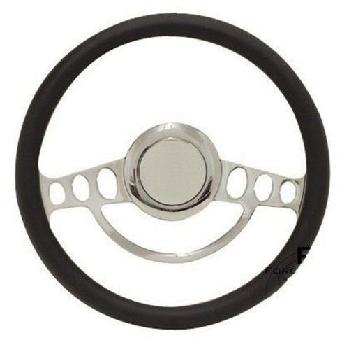 Hot New Product! 14" Nostalgia Style Chrome and Black Vinyl 14" Steering Wheel - Nine Hole for Aftermarket Columns with nine-hole adapters - Flaming River, Ididit, etc. Specifications: 14" chrome wheel with black vinyl half wrap 9 Hole wheel Behind the wheel is billet finished with smooth finger grooves You will need a 9-hole installation adapter to install this wheel All mounting bolts included This set includes the wheel, half wrap & Horn Button Adapter Sold Separately