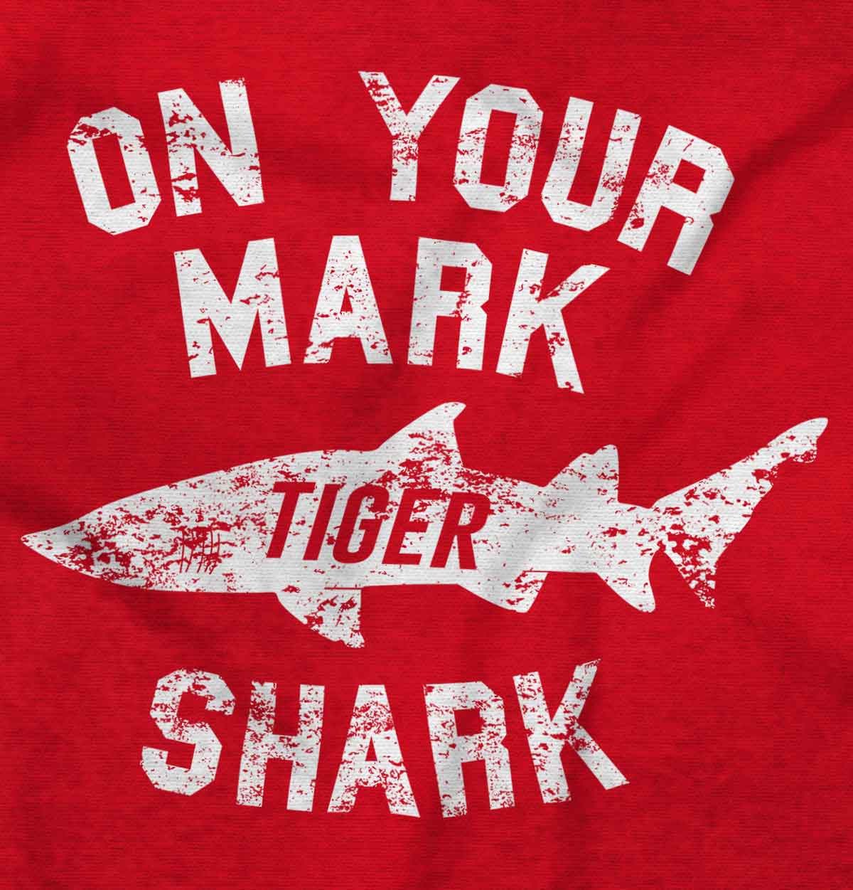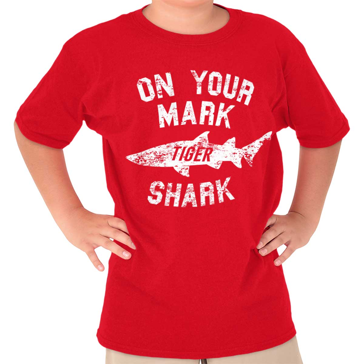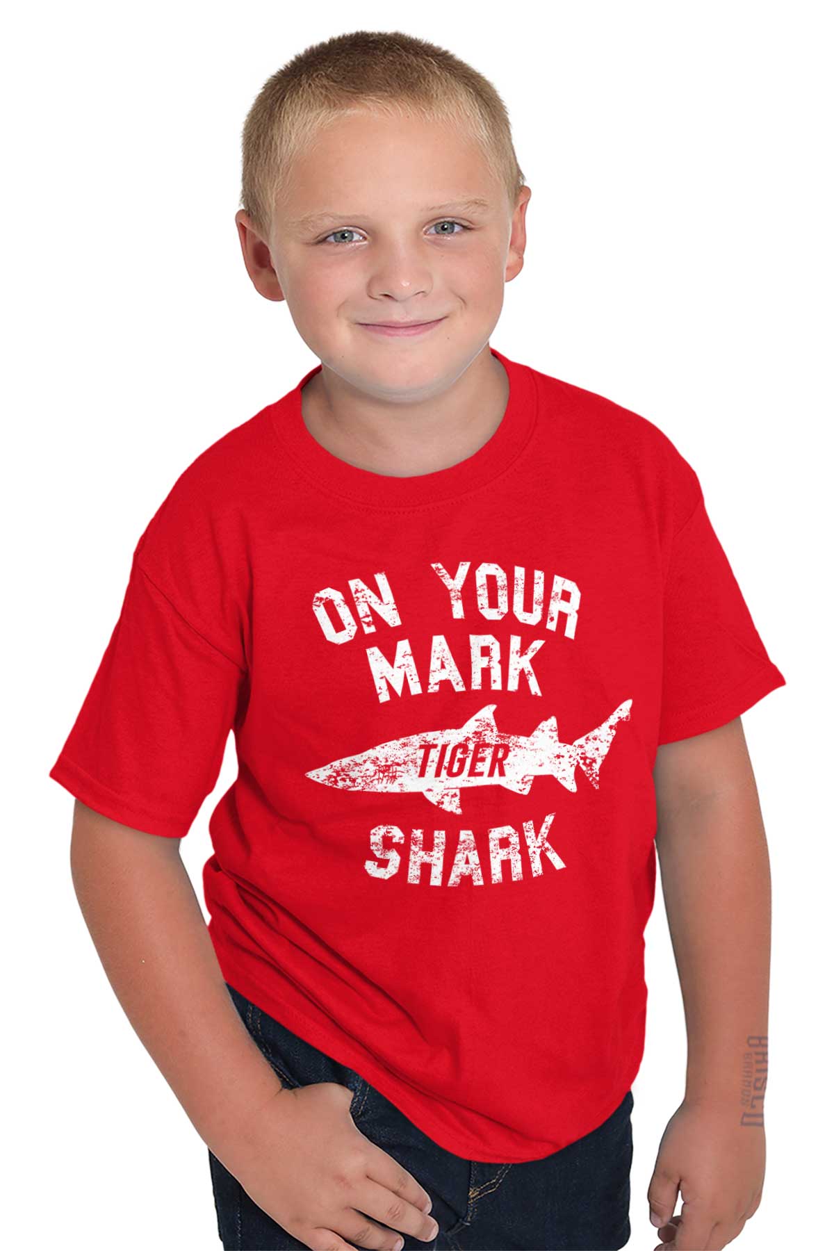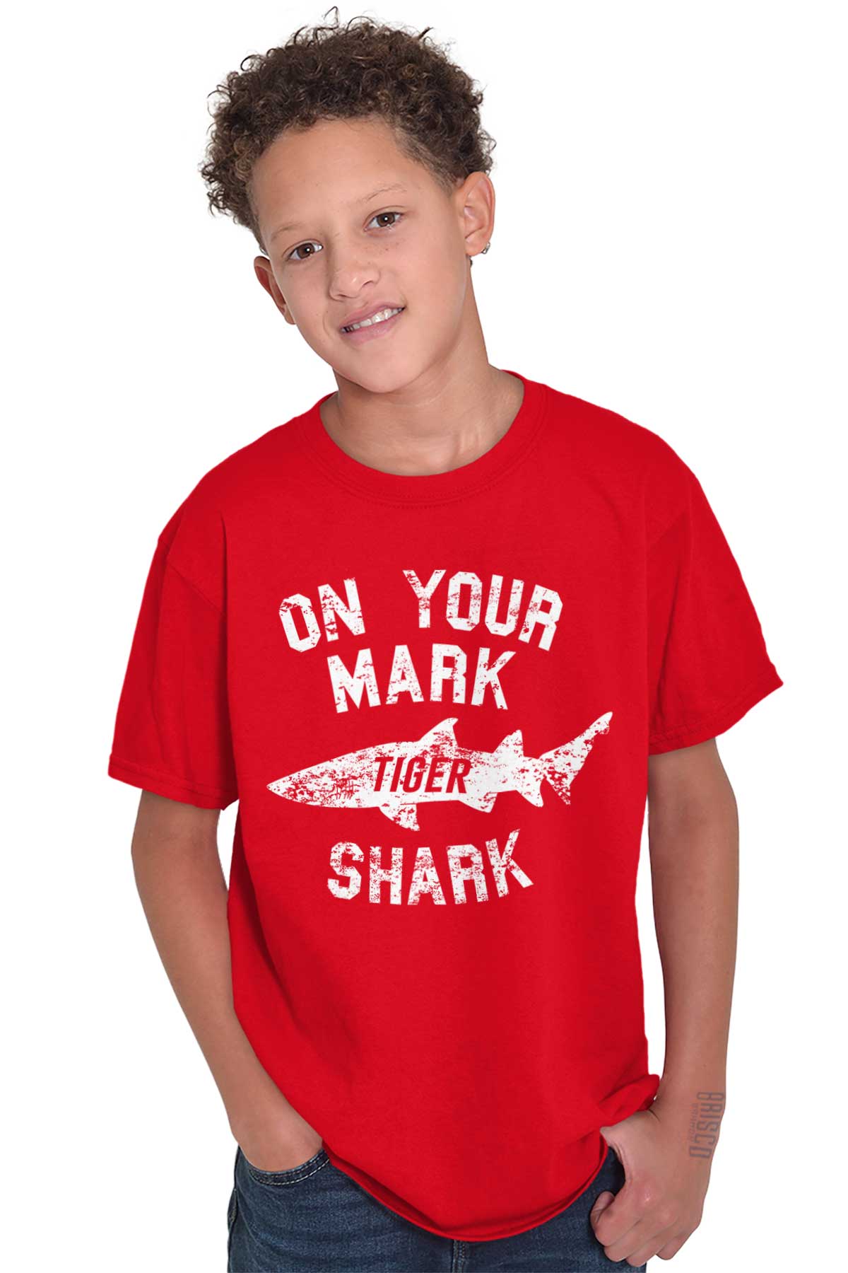 On Your Mark Tiger Shark: Barron Trump's new viral choice of shirt! The kid's got some style, I mean, who doesn't love sharks, right? Sharks are cool and awesome and amazingly impressive swimmers - they ARE basically the kings of the ocean after all! Do you like sharks too? Join the quickly growing buzz and get your own tee to match the country's new pre-teen trend-setter. Be on top of the hype with this awesome design on our super comfortable Heavy Cotton Youth T-Shirt!