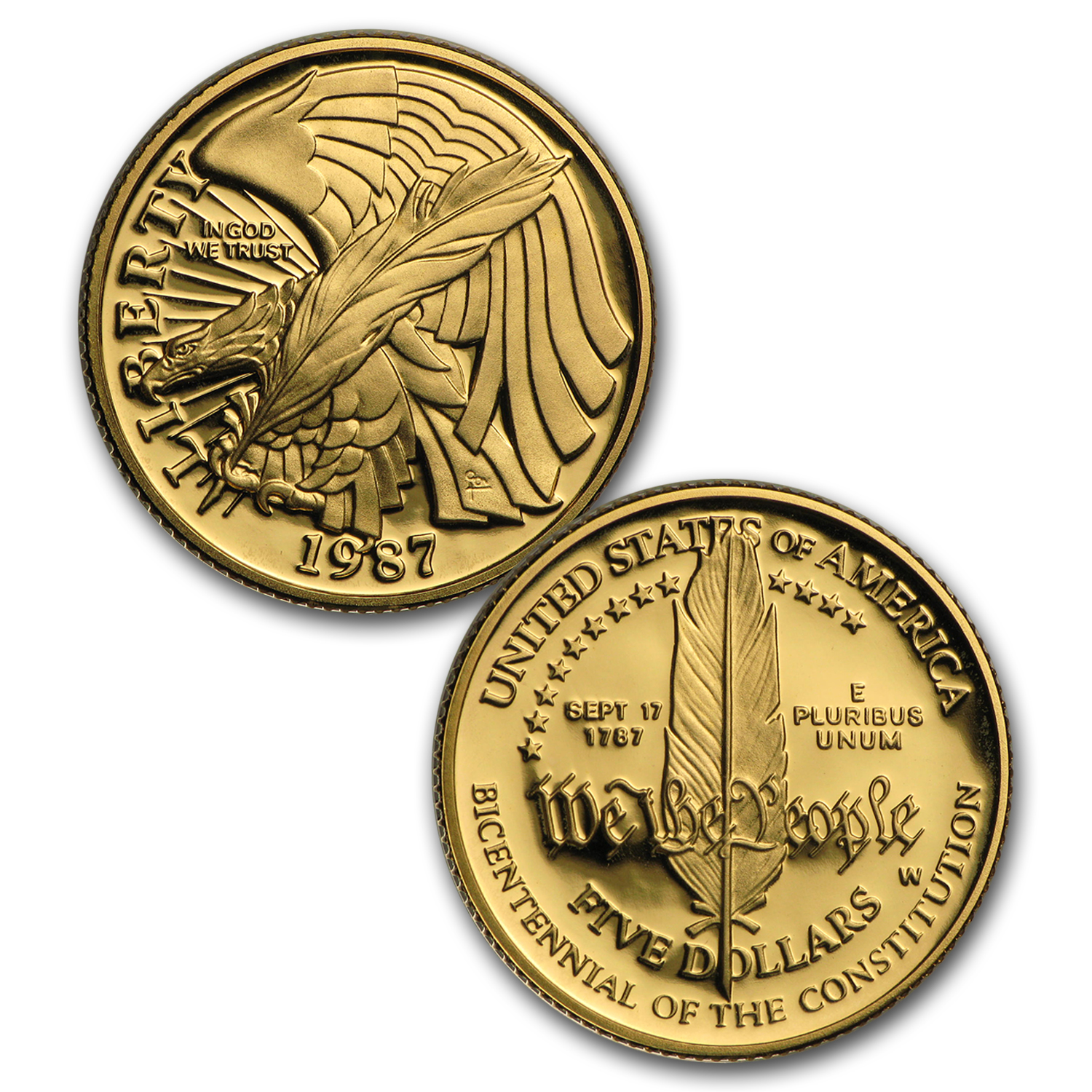 - Five Dollar Gold Reverse: Exhibits a writing quill with WE THE PEOPLE written in stylized font on top of the quill.
