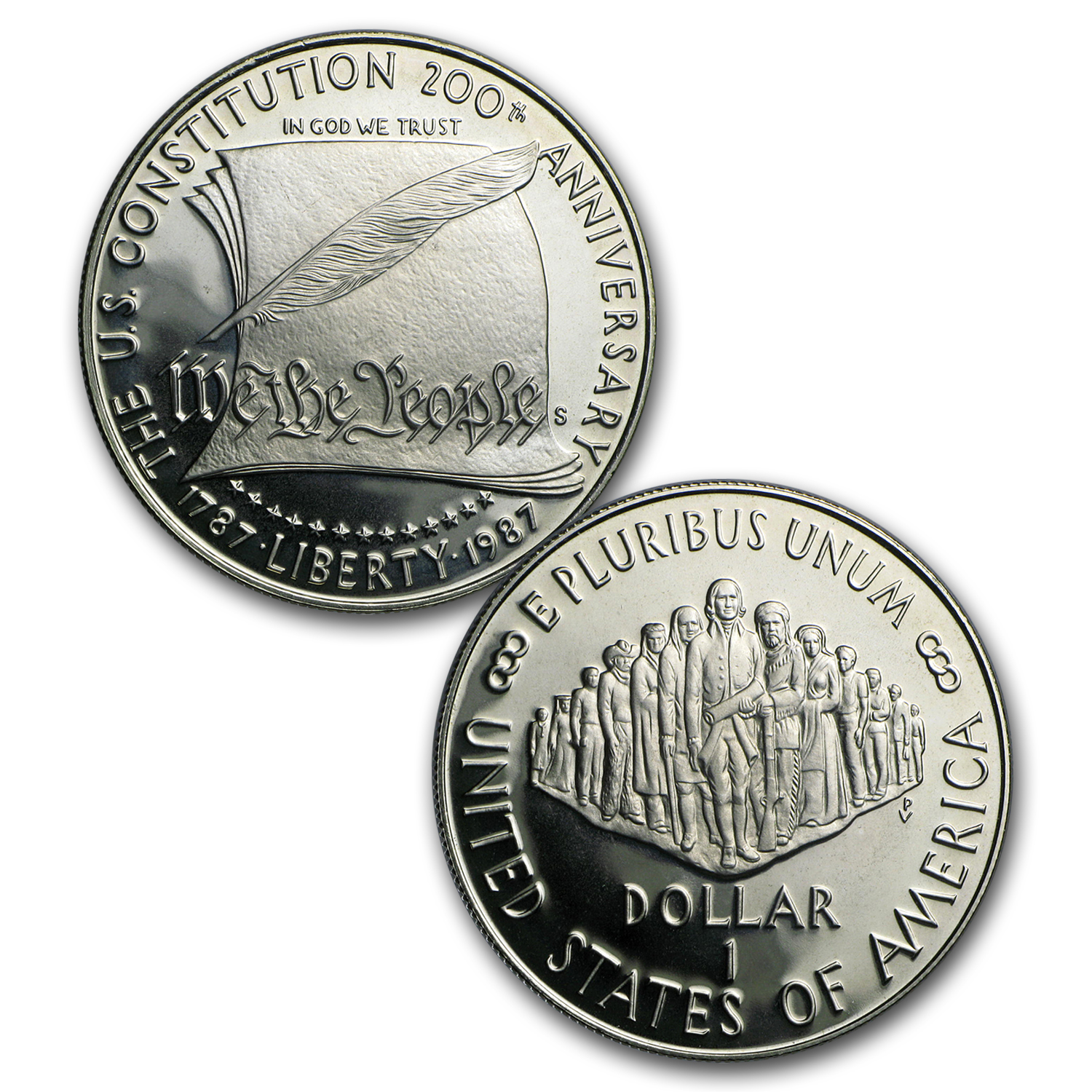 - One Dollar Silver Reverse: Depicts an illustration of the signers of the U.S. Constitution.