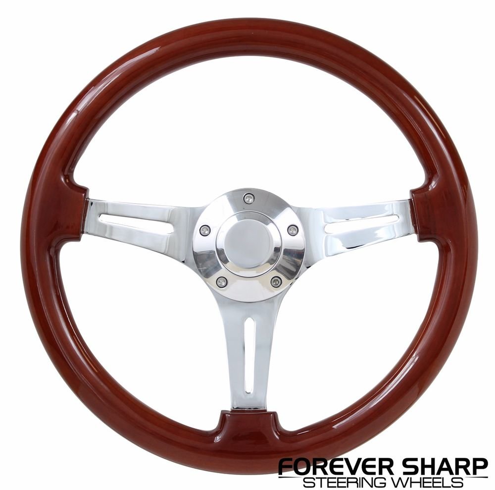 Forever Sharp 14" Classic Wood Steering Wheel Set: 69-89 Cadillac Part : 2004F-A01 Includes: Steering Wheel YES Horn Button YES Installation Adapter YES DESCRIPTION: 14" Classic Chrome Wood Steering Wheel - 14" Outside Diameter - Real Red Mahogany Full Wood Grip. Back of Steering Wheel Features Finger Grooves. - Dish Depth Approx: 1 .75" - Chrome Plated Split Spoke Design - Uses Standard 5 Bolt Pattern - Includes High Polish Aluminum Horn Button - Polished Adapter Fits 1969-89 Cadillac Stock and All Late Model GM Aftermarket Steering Columns. See below for your vehicle compatibility. If you would like to confirm fitment for your vehicle or steering column, please give us a call at: 888-878-2156 This steering wheel set will fit: Cadillac - 1969-1989 All Models w/ Non-Telescopic Columns ALSO FITS: American Motors - 1970-1988 All Models (Excluding Renault Alliance & Encore Models) Buick - 1969-1993 All Models w/ Non-Telescopic Columns Chevy/GM - 1969-1994 Chevrolet Car Models (Excluding Corvette, Sprint, Spectrum, 1986-1988 Nova Models) - 1974-1994 Chevy/GM Truck Models - All Late Model Chevy/GM Aftermarket Steering Columns Dodge/Chrsyler/Plymouth - 1978-1981 All Car Models w/ Tilt Columns - 1979-1981 All 2/4WD Pick-Up, Trailduster, Ramcharger, Van Models w/ Tilt Columns Jeep - 1976-1995 All CJ5, CJ6, CJ7, Wrangler, Cherokee, Wagoneer, Pick-Up, Scrambler, Comanche Models - 1974-1975 All Cherokee, Wagoneer, Pick-Up Models Oldsmobile - 1969-1993 All Models w/ Non-Telescopic Columns Pontiac - 1969-1993 All Models (Excluding 1988+ LeMans Models)