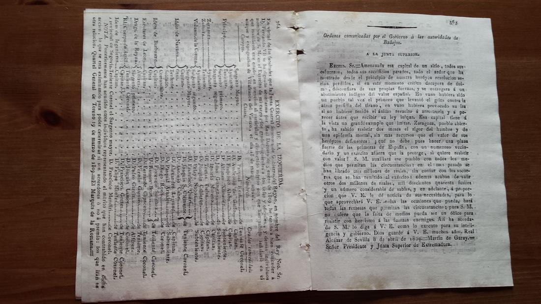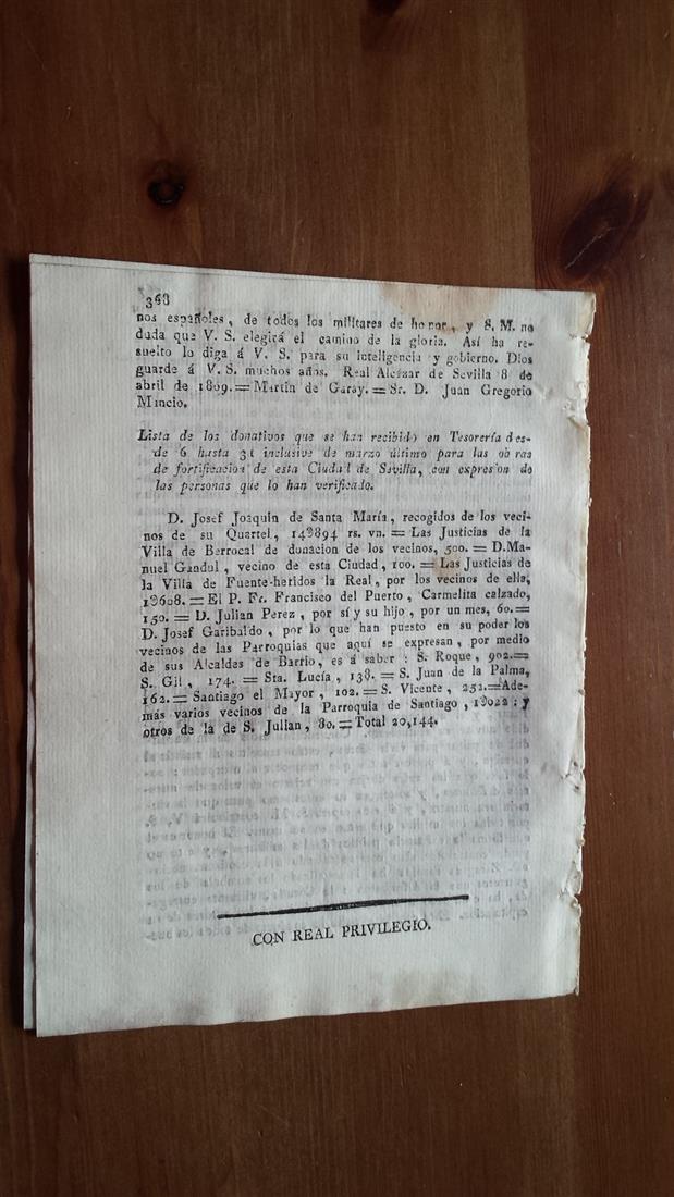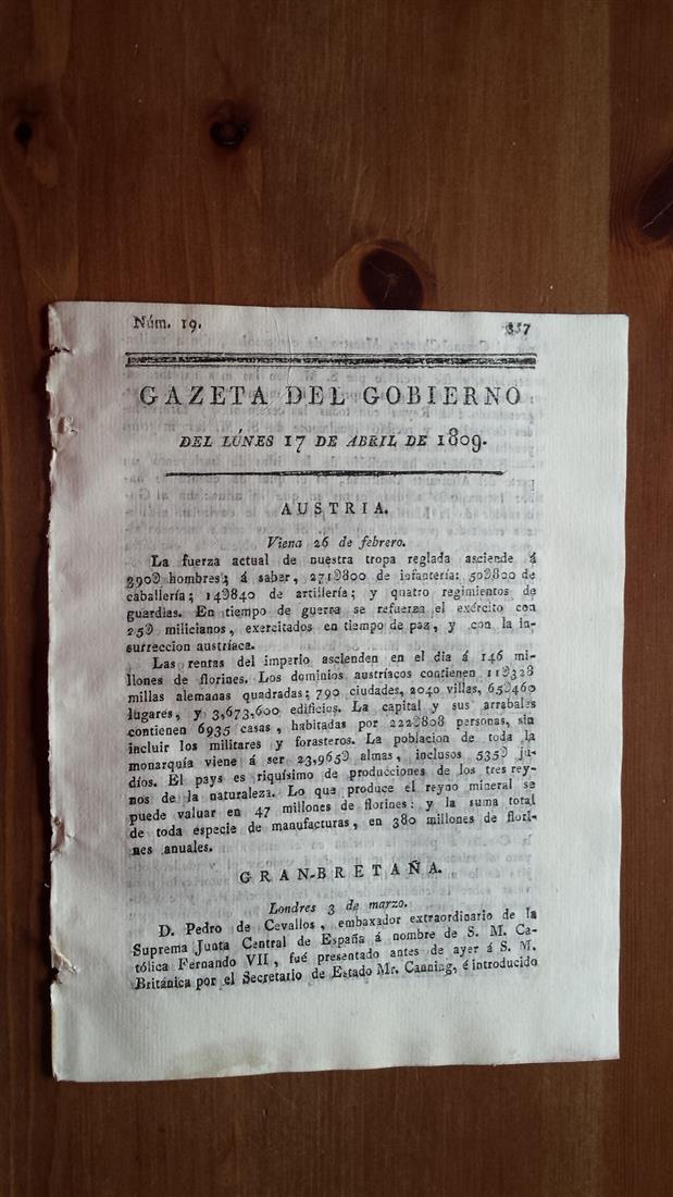 Autor: Varios ------------------------------------------------------------------- Título: Núm.19 Gazeta del Gobierno del Lúnes 17 de Abril de 1809 Austria. Viena 26 de febrero.....Londres....Sevilla. El Sr. Maruqes de la Romana, General.....Parte del Mariscal de Campo Gabriel de Mendizabal al General en xefe Sr. Marqués de la Romana......Exercito de la Izquierda......Ordenes comunicadas por el Gobierno á las autoridades de Badajoz. A la Junta Superior....... Al Teniente General D. Antonio Arce....Real Alcazar de Sevilla 8 de abril de 1809..... Al Gobernador de la Plaza...... ------------------------------------------------------------------- Fecha de Publicación: 1809 ------------------------------------------------------------------- Páginas: 12 (Desde página 357 a 368) ------------------------------------------------------------------- Dimensiones: cm. 19,6x14,8 ------------------------------------------------------------------- Estado de conservación: Conservación como fotografías. Generalmente las páginas siempre tienen pequeños agujeros en el margen izquierdo, a veces puede haber desgarros y pequeñas faltas de papel. En general manchas y pliegues. En todos los casos es posible entender la conservación de las fotografías publicadas, si teneis preguntas por favor póngase en contacto con nosotros. ------------------------------------------------------------------- Descripción: Las páginas no están cosidas o encuadernadas. Gazeta del Gobierno Al llegar a Sevilla a refugiarse, la Junta Central Gubernativa del Reino empezará a publicar este periódico, el 6 de enero de 1809, en sustitución de la Gazeta de Madrid, que había quedado en manos de las nuevas autoridades francesas. Como órgano oficial de la misma y con periodicidad algo irregular, entre uno y tres días a la semana, incluirá una amplia información bélica de toda Europa, así como noticias de las operaciones militares y patrióticas que se suceden en las diferentes provincias españolas contra el ejército napoleónico, además de las alocuciones, bandos, proclamas, edictos, etc., que emanan del órgano supremo político de la España en guerra contra el ejército imperial bonapartista, así como su composición territorial y orgánica, y partes militares, cartas y otros documentos emitidos desde las diversas juntas provinciales o que son interceptados al enemigo. También incluirá en ocasiones algunas noticias particulares. Ver título y Fotos ------------------------------------------------------------------- ------------------------------------------------------------------- |