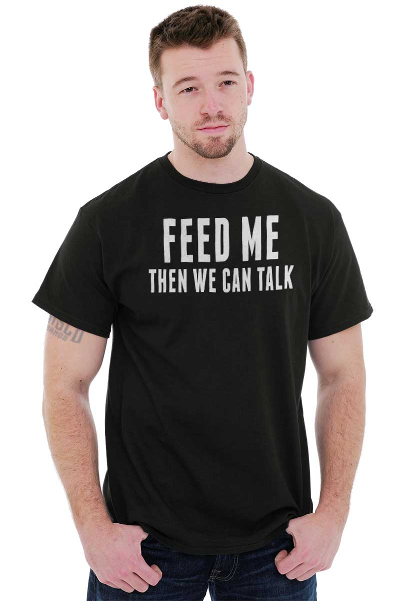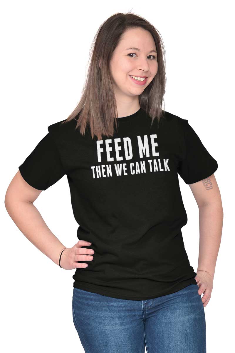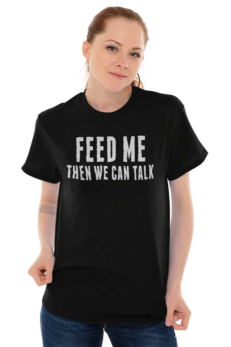 Hunger pains are not sexy. They are not becoming of anyone, but even worse for you. The literal feeling of emptiness can leave even the fiercest woman moody and unappealing. Let those around you know that they do not want to partake in your grumpiness. With this funny T Shirt, state your feelings right on your chest: “Feed Me Then We Can Talk”. Even if your stomach is not full, you can look sexy and feel comfortable while asserting your moodiness is just part of your cravings. Sarcastically show that it can be fixed – just feed me!