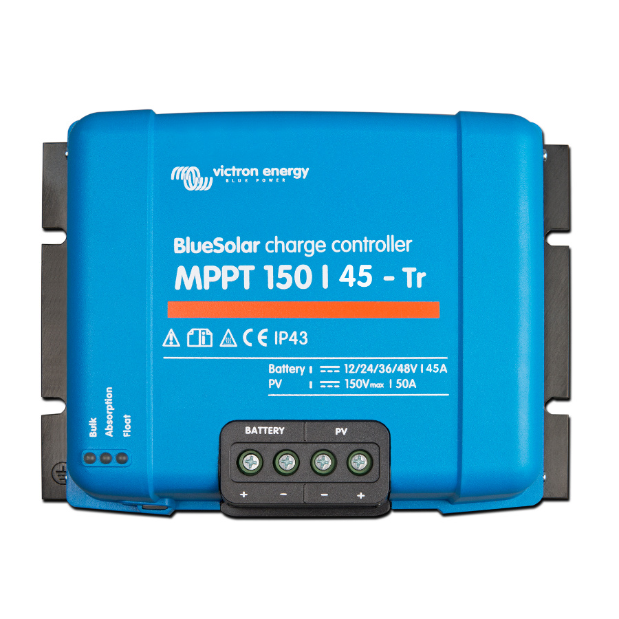 ![]() Photonic Universe is an official distributor of products from Victron Energy - the globally renowned manufacturer of high quality hybrid power electronics. Victron Energy solar charge controllers have a longstanding reputation for their outstanding reliability, innovative design and superior build quality. This Victron 150V 45A MPPT controller comes from the intelligent BlueSolar range, which uses the latest ultrafast MPPT technology to maximise energy harvest whilst maintaining optimal battery health. BlueSolar MPPT controllers uniquely boast an intelligent battery life function, along with advanced communication options for remote system monitoring. Ultrafast MPPT Technology: This 45A MPPT solar charge controller is designed to deliver the highest possible energy yield in the shortest amount of time. This is achieved through the use of high speed Maximum Power Point Tracking technology, which tracks the maximum power voltage point of the solar panels as it varies depending on sunlight exposure and temperature. This technology enables the controller to produce up to 30% greater energy yield than PWM controllers and as much as 10% more power than slower MPPT controllers. This advanced technology allows the controller to perform extremely well in low-light or cloudy conditions, as the controller consistently strives to extract the maximum available power from the solar array. Inbuilt safety protection: Fully equipped with an extensive range of safety features, this controller offers complete protection against potential hazards such as PV short circuit, PV reverse polarity, PV reverse current, battery reverse polarity and battery overheating - monitored via the internal temperature sensor. The controller also has self-diagnostic capability and highlights any system errors using sophisticated fault-targeting technology. These are signalled via the high intensity LED indicators. Advanced programming and monitoring: The user can connect an optional MPPT Control Panel (sold separately) to the controller to access a range of monitoring and programming functions. The display shows charging parameters (voltage, current, power) for the solar panel and battery as well as 30 day performance data. The user can also set the duration and voltage of each charging stage. Alternatively, by connecting the controller to a Victron VE Direct Bluetooth Dongle, or the VE Direct USB Cable (both sold separately), the user can gain access to the VictronConnect App, which unlocks numerous possibilities for advanced programming and remote monitoring of your BlueSolar system. Once the controller is paired with the app, a wide range of additional features are made available, including: Live data transmission: Real-time information is displayed including solar panel output, battery voltage and current (flowing into and out of the battery) as well as battery state of charge. Detailed data logs: System activity for the past 30 days is available to view; either as in-depth daily logs or as a monthly summary. These easy-view graphics display daily energy yield, maximum recorded power and voltage, time spent in each charging stage, minimum and maximum recorded battery voltages, error records and total energy counters. User-defined battery charging algorithm: Option to disable pre-set values in favour of personalised charging parameters, including user-defined absorption voltage, absorption time, float voltage, equalisation voltage and temperature compensation settings. The VictronConnect app is compatible with most mobile devices and computers, including Android and iOS smartphones, tablets, iPads, MacBooks, Windows PCs/laptops. Other features: The Victron BlueSolar MPPT 150-45 model is ideal for a wide range of applications as it is resistant to extreme temperatures, high altitudes, dusty environments and marine environments. The unit enclosure is IP43 water resistant with resin encapsulation of the internal electrical components and has a PD3 pollution rating. This solar charge controller is also compatible with a wide range of battery types, including AGM, Gel, Tubular plate and Lithium batteries. Specifications: