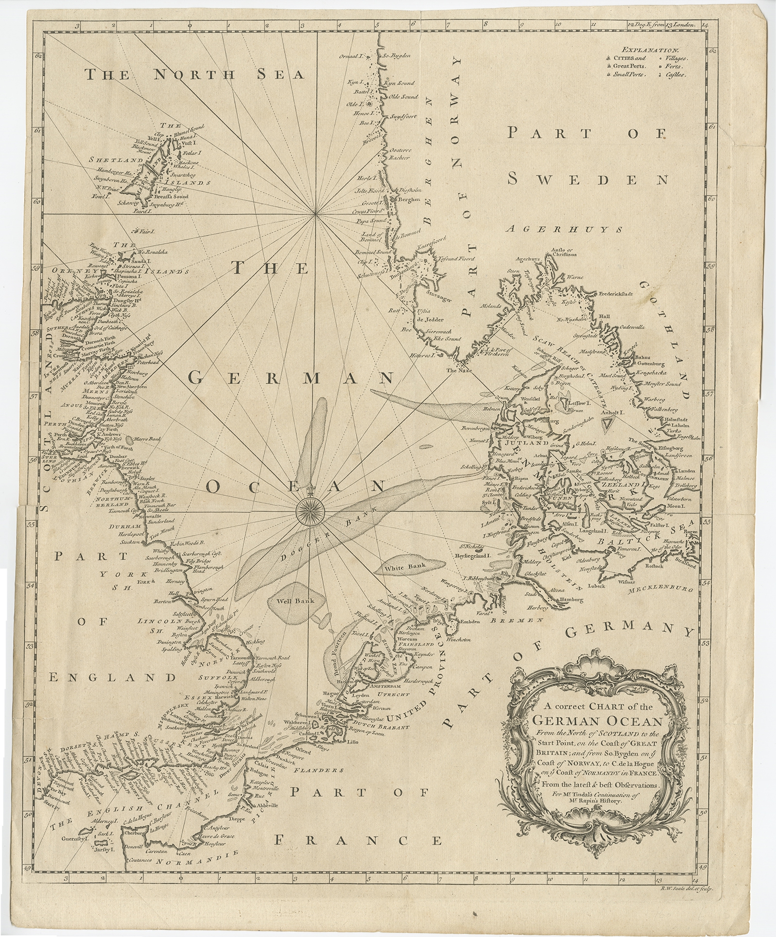 Antique Map of the North Sea by Seale (1746) $ 576.68 Availability: in stock Condition : Good. Some tears, mainly along folding lines. Please study image carefully. Date : 1746 Overall size : 40 x 51 cm. Image size : 38 x 48 cm. Description: Antique map titled 'A correct Chart of the German Ocean from the North of Scotland to the Start Point, on the Coast of Great Britain; and from So. Bygden on ye coast of Norway, to C. de la Hogue on ye Coast of Normandy in France'. This map depicts the region from the English Channel to Norway and Sweden. Artists and Engravers: Engraved by R.W. Seale. |