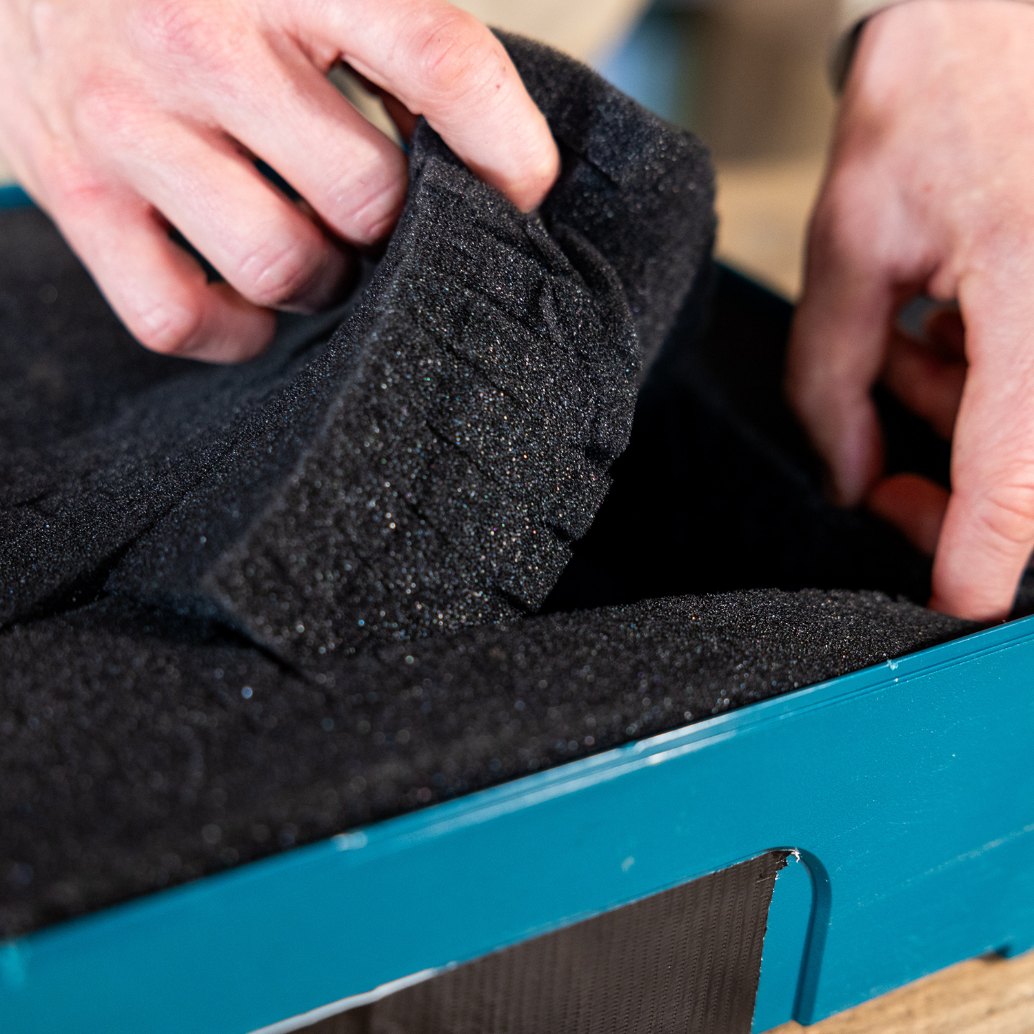 Die universell einsetzbare Schaumstoffeinlage von HMF ist ideal zum sicheren Transport von Modellen, Objektiven oder anderen empfindlichen Gegenständen.