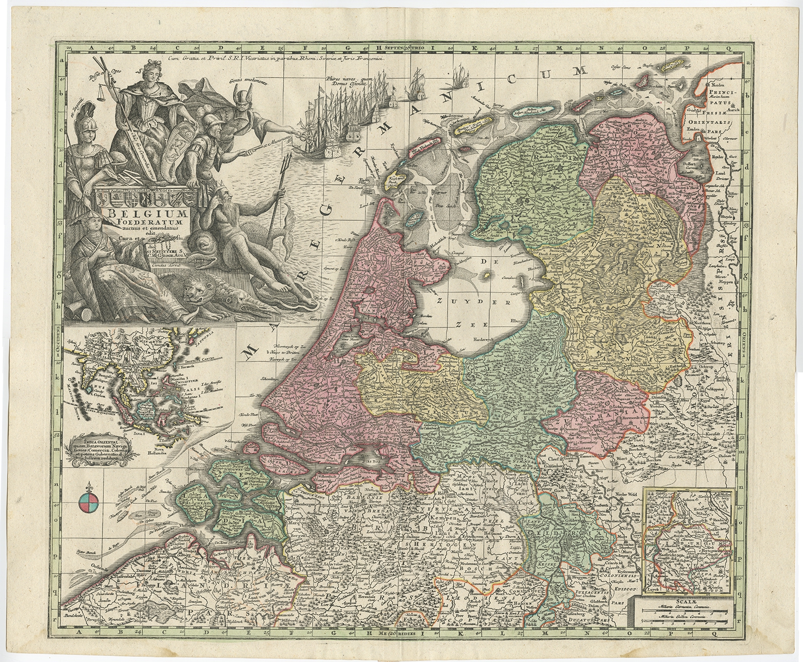 Antique Map of the Seven United Provinces of Holland by Seutter (1727) $ 852.66 Availability: in stock Condition : Very good. General age-related toning. Minor staining at the bottom of the print. Please study image carefully. Date : 1727 Overall size : 64 x 53 cm. Image size : 57 x 49 cm. Description: Antique map titled ‘Belgium Foederatum Auctius Et Emendatius‘. Important antique map of the Seven United Provinces of Holland with inset views of the East Indies, the province of Limburg and a fleet of navy ships. Includes a decorative allegorical title cartouche with the coat of arm of the Seven United Provinces. Artists and Engravers: Matthaeus Seutter, German cartographer and engraver, was a contemporary and rival of Homann. He was apprenticed to Homann and created his own business in 1707 in Augsburg. He produced several atlases including the "Tabulae Geographicae", "Atlas Novus", and "Atlas Minor". His maps are very similar (at least in style) to those of Homann. |