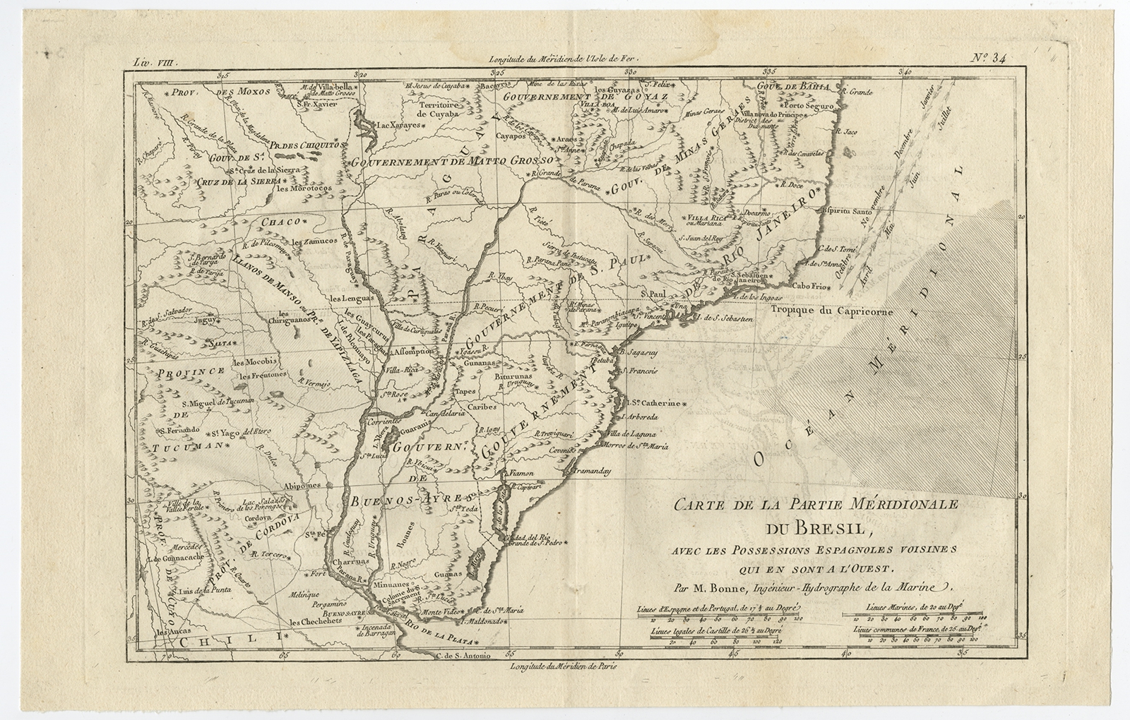 Antique Map of Southern Brazil by Bonne (c.1780) $ 158.29 instead of Availability: in stock Condition : Very good. Please study image carefully. Date : c.1780 Overall size : 38.5 x 25 cm. Image size : 32 x 23 cm. Description: Antique map titled 'Carte de la Partie Méridionale du Bresil (..)'. This antique map of Brazil depicts southern Brazil, Uruguay, and northern Argentina, including Rio de Janeiro, Montevideo, and Buenos Aires. Published by R. Bonne. Artists and Engravers: Rigobert Bonne (October 6, 1727 - September 2, 1794) was one of the most important French cartographers of the late 18th century. Bonne was born in Ardennes à Raucourt, France. He taught himself mathematics and by eighteen was a working engineer. During the War of the Austrian Succession (1740 - 1748) he served as a military engineer at Berg-op-Zoom. It the subsequent years Bonne became one of the most respected masters of mathematics, physics, and geography in Paris. In 1773, Bonne succeeded Jacques-Nicolas Bellin as Royal Cartographer to France in the office of the Hydrographer at the Depôt de la Marine. Working in his official capacity, Bonne compiled some of the most detailed and accurate maps of the period - most on an equal-area projection known erroneously as the 'Bonne Projection.' Bonne's work represents an important step in the evolution of the cartographic ideology away from the decorative work of the 17th and early 18th century towards a more scientific and practical aesthetic. While mostly focusing on coastal regions, the work of Bonne is highly regarded for its detail, historical importance, and overall aesthetic appeal. Bonne died of edema in 1794, but his son Charles-Marie Rigobert Bonne continued to publish his work well after his death.