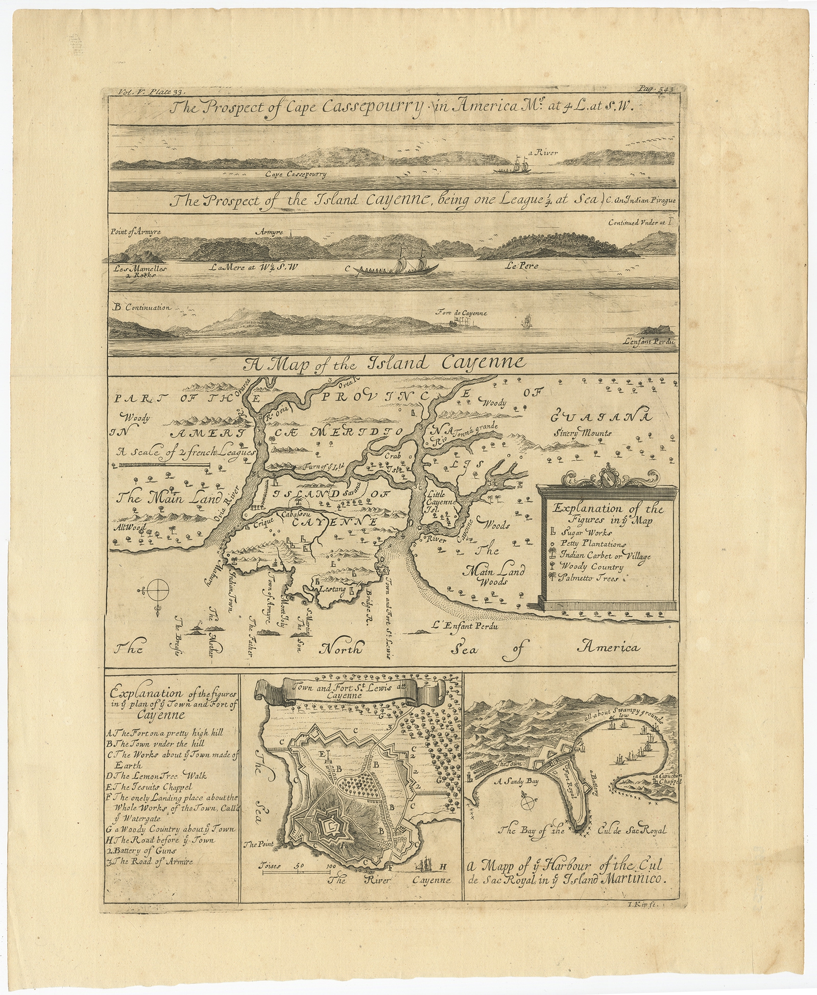Antique Map of Cayenne and Cassepouri by Kip (c.1730) $ 447.22 Availability: in stock Condition : Good. General age-related toning. Please study image carefully. Date : c.1730 Overall size : 34.5 x 42 cm. Image size : 25.5 x 36 cm. Description: Antique map titled 'A Map of the Island Cayenne (..)’. A set of interesting copper engravings of Cayenne and Cassepouri, French Guinea, South America, and Martinique in the West Indies. The map of Cayenne, home of Cayenne pepper, has a key of symbols identifying the sugar works, petty plantations, indian carbet or village, woody country and palmetto trees. The plan of Fort Lewis, Cayenne also has a lettered key including; A. the fort on a pretty high hill, d.the lemon tree walk, f. the only landing place about the whole works of the town call'd ye watergate, etc. Artists and Engravers: Born in the Netherlands, Johannes Kip settled in England around 1690. He was a topographical engraver most famous for his depictions of country houses in the book; ‘Britannia Illustrata’ on which he collaborated with Leonard Knyff (1707). Although this is his most well known work, he was a prolific artist who worked on many other important projects and commissions, including the illustrations for Churchill’s ‘Voyages’. |