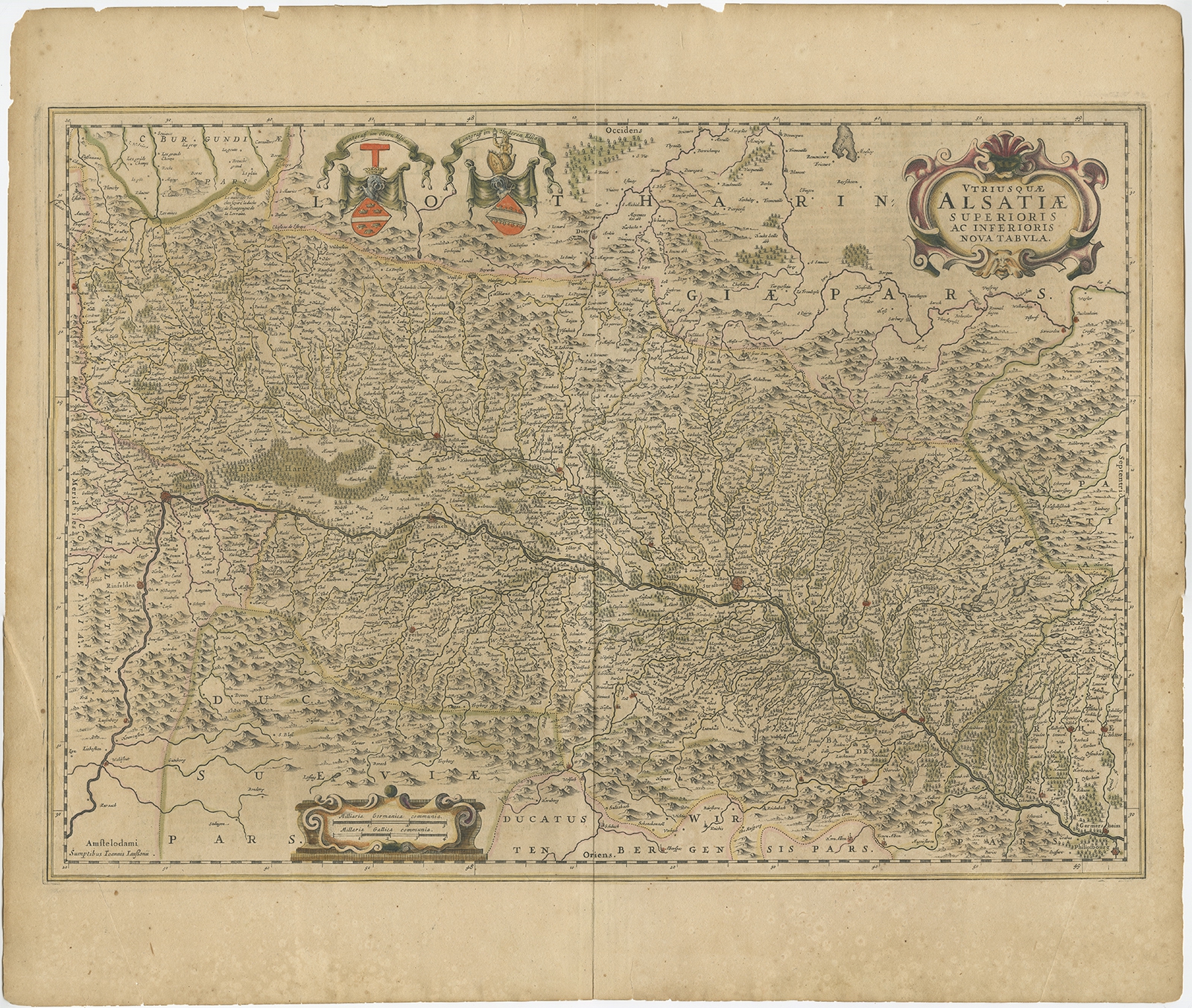 Antique Map of the Alsace region of France by Janssonius (c.1650) $ 423.68 instead of Availability: in stock Condition : Fair, age-related toning. Tear at both lower left and right corner, some smaller marginal tears. Original, contemporary hand coloring. Dutch text on verso. Please study image carefully. Date : c.1650 Overall size : 59 x 50 cm. Image size : 54.5 x 39 cm. Description: Antique map titled 'Utriusquae Alsatiae Superioris Ac Inferioris Nova Tabula'. Map of the Alsace region (France) including the Rhine from Phillipsburg to south of Basle. Two decorative cartouches and two coats of arms. Artists and Engravers: Johannes Janssonius (Jansson), ( 1588- 1664) Amsterdam was born in Arnhem, the son of Jan Janszoon the Elder,a publisher and bookseller. |