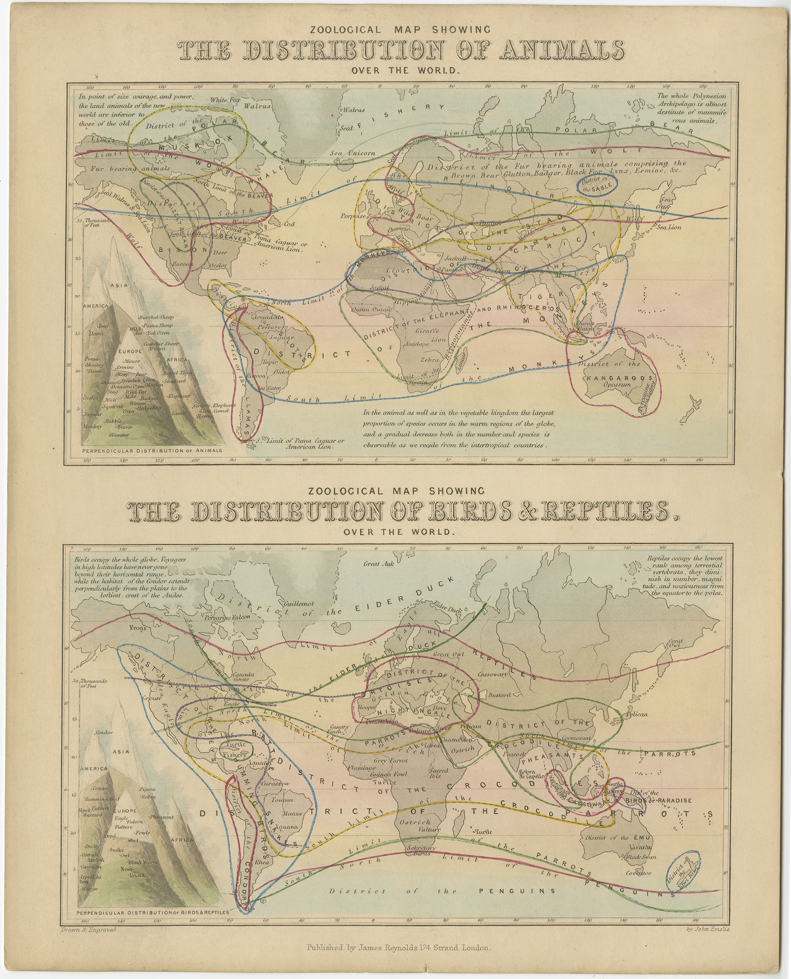 Antique Zoological Map by Reynolds (1843) $ 210.08 Availability: in stock Condition : Good, general age-related toning. Please study image carefully. Date : 1843 Overall size : 22.7 x 28.5 cm. Image size : 19.5 x 26.5 cm. Description: Two antique world maps on one sheet. The upper map shows the distribution of animals over the world. The lower map shows the distribution of birds & reptiles over the world. Originates from 'Geographical Diagrams '. Artists and Engravers: Published by J. Reynolds, London. |