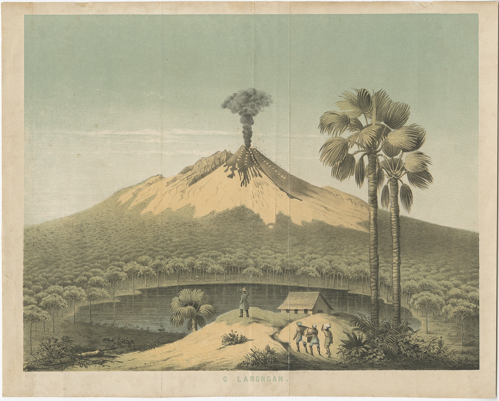 Antique Print of Gunung Lamongan by Junghuhn (c.1853) $ 325.41 instead of Availability: in stock Condition : Good, minor wear. General age-related toning. Please study image carefully. Date : c.1853 Overall size : 30 x 25 cm. Image size : 28 x 22 cm. Description: Antique print titled 'G. Lamongan'. Beautiful lithograph of Gunung Lamongan. Gunung Lamongan or Mount Lamongan (1,651m - 5, 417 ft) is a small stratovolcano located between the massif Tengger caldera complex and Iyang-Argapura volcano complex in East Java, Indonesia. Artists and Engravers: Made after F.W. Junghuhn. Friedrich Franz Wilhelm Junghuhn was a German-Dutch botanist and geologist. |