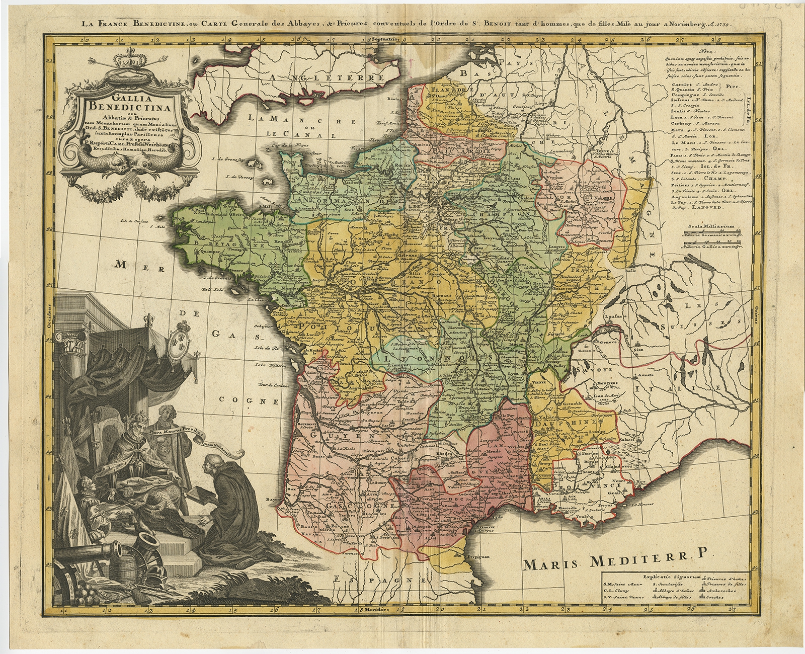 Antique Map of France by Homann (1738) $ 882.67 Availability: in stock Condition : Good, general age-related toning. Stain on top, please study image carefully. Date : 1738 Overall size : 61 x 50 cm. Image size : 55 x 45 cm. Description: Antique map titled 'Gallia Benedictina seu Abbatiar & Prioratus tam Monachorum quam Monialium Ord. S. Benedict (..)'. Beautiful antique map of France with the provinces of the Order of Saint Benedict. With decorative cartouche with an historical scene with the king of France, who is sitting under a baldachin. In front of him kneels a Benedictine friar, who is holding a book in his hand. Artists and Engravers: Homann Heirs was a German publishing firm that enjoyed a major place in the European map market throughout the eighteenth century. Founded in 1702 by Johann Baptist Homann, the business passed to his son, Christoph, upon Johann’s death in 1724. Christoph died in 1730, aged only 27, and the firm was inherited by subsequent Homann heirs. This altered the name of the company, which was known as Homann Erben, or Homann heirs. The firm continued in business until 1848. |