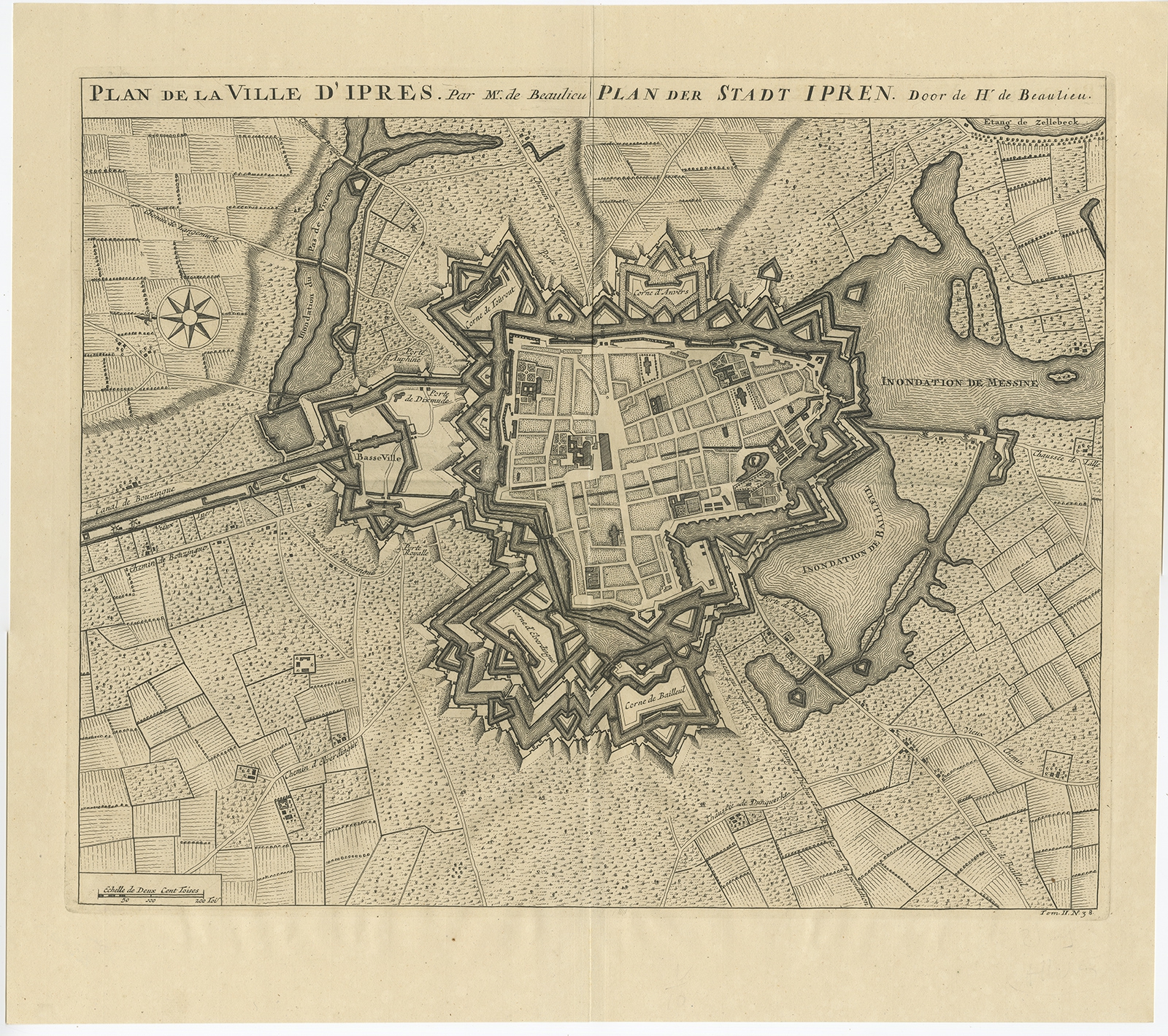 Antique Map of the City of Ypres by Beaulieu (1729) $ 261.86 Availability: in stock Condition : Very good, please study image carefully. Date : 1729 Overall size : 55 x 49 cm. Image size : 48.5 x 40 cm. Description: Antique map titled 'Plan de la Ville d'Ipren/Plan der Stadt Ipren'. Map of the city of Ieper/Ypres in Belgium. This map originates from 'Histoire Militaire du Prince Eugene de Savoye, du Prince et Duc de Marlborough, et du Prince de Nassau-Frise' by I. van der Kloot. Artists and Engravers: Author: Sébastien Pontault d'Beaulieu. |
