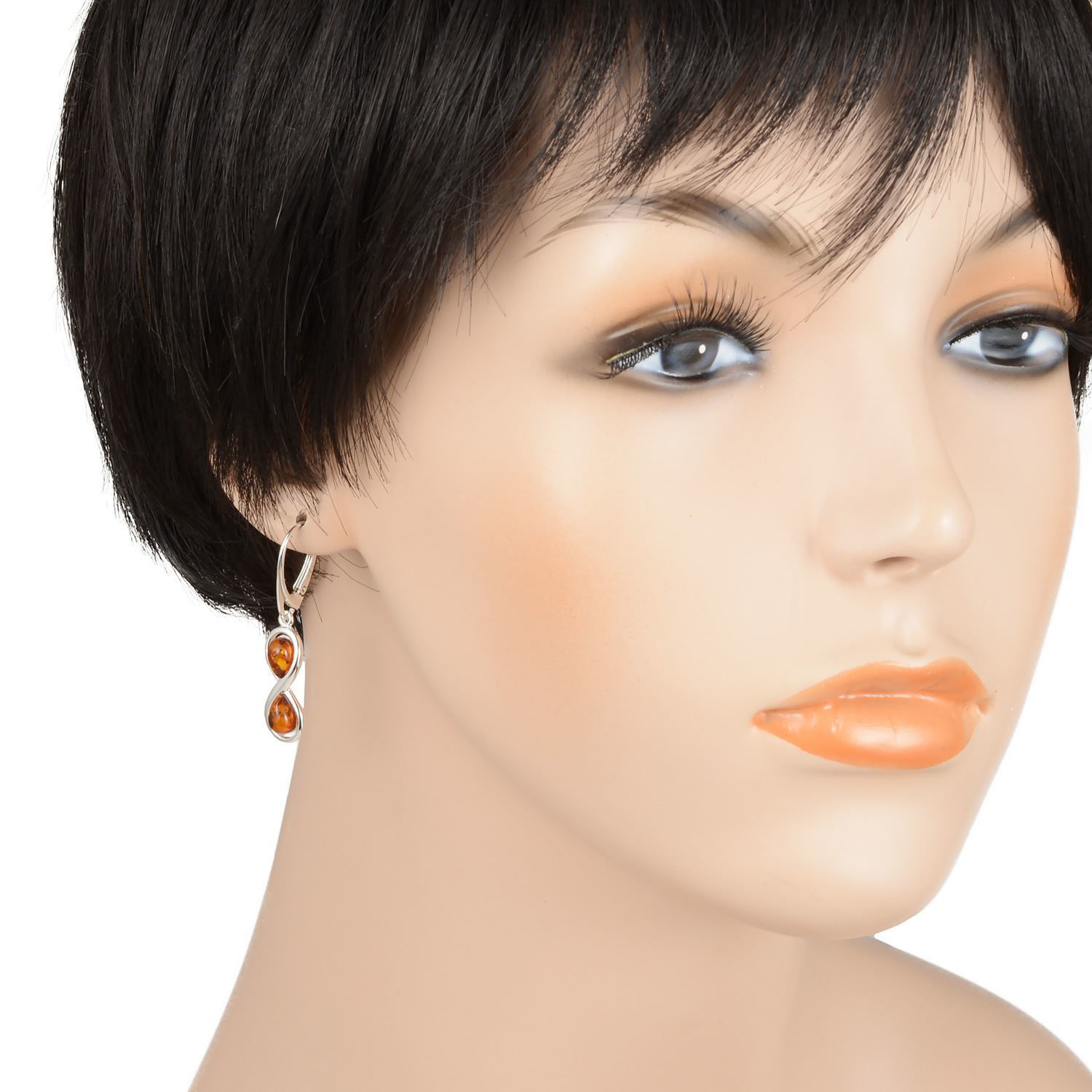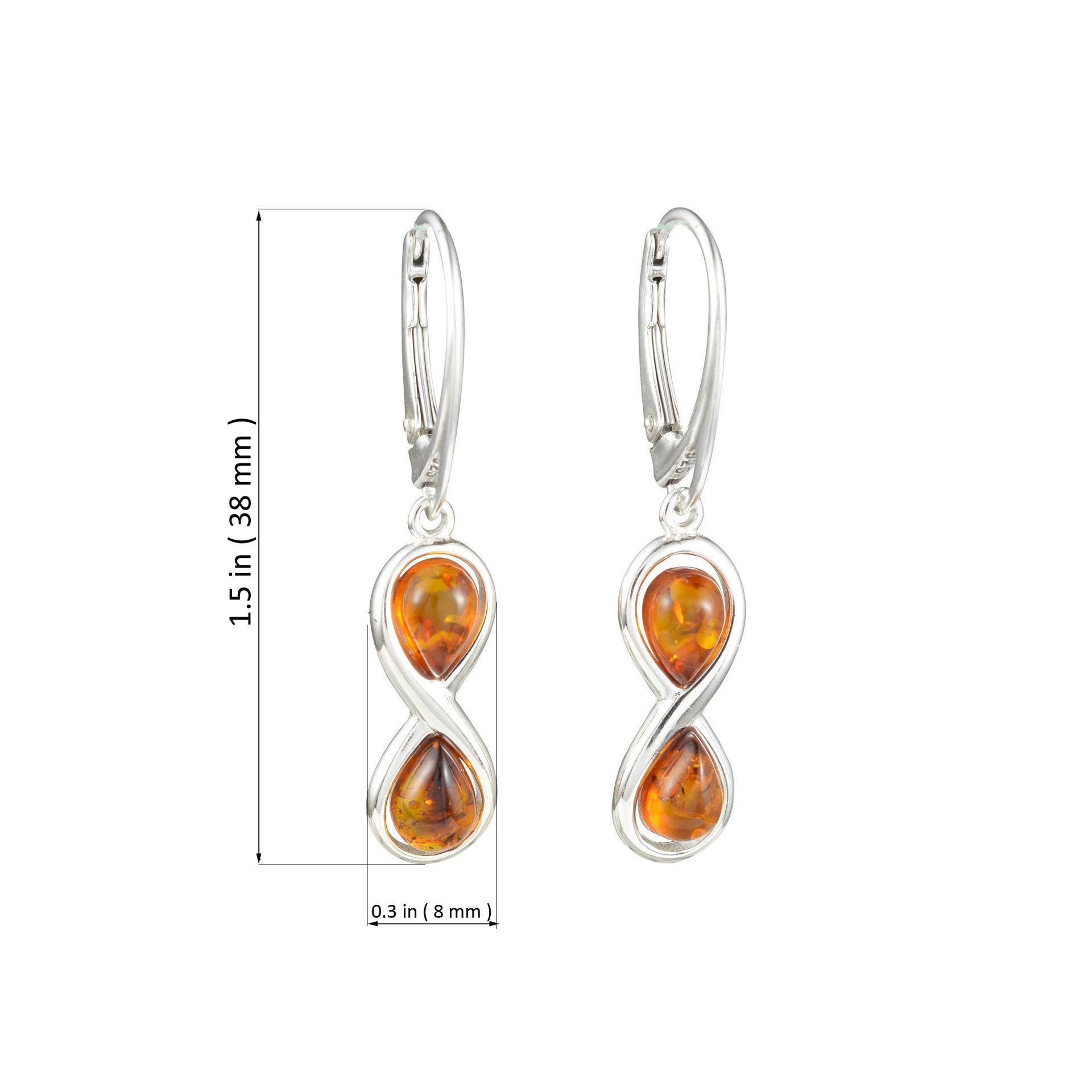 Material: Baltic Amber 925 Sterling Silver amber earrings Total Length: 1.5"; Total Weight: 3.62 g. These modern sterling silver Baltic amber earrings in the shape of the infinity sign have a french leverback closure. The amber earrings have two-pear shaped 0.27" x 0.18" cognac stones. They can be worn together with the "Infinity" ring. Since amber is a natural stone, you will receive a product slightly different from the one shown in the picture. Handcrafted in Europe. amber earrings are sold with a velvet pouch bag.