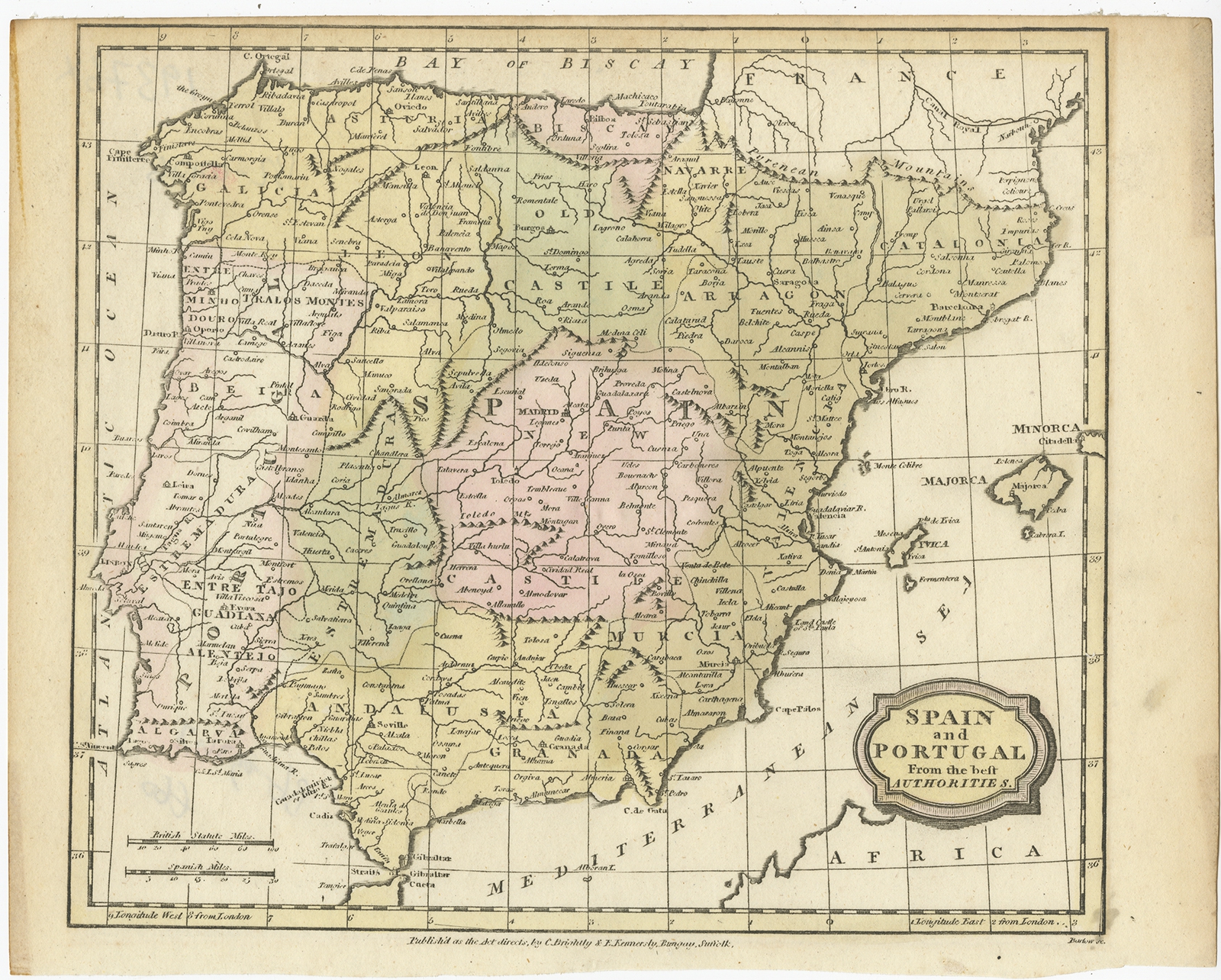 Antique Map of Spain and Portugal by Barlow (1809) $ 93.56 instead of Availability: in stock Condition : Very good, original/contemporary hand coloring. Please study image carefully. Date : 1809 Overall size : 25 x 20 cm. Image size : 22 x 19 cm. Description: Antique map titled 'Spain and Portugal from the best Authorities'. Detailed antique map of Spain and Portugal. This map originates from 'The General Gazetteer'. Artists and Engravers: Engraved by Barlow. Published by Brightly and Kennersly. |