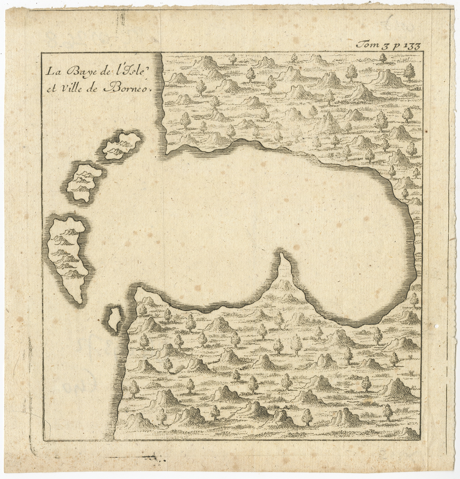 Antique Map of a Bay of Borneo (c.1760) $ 102.98 Availability: in stock Condition : Good, general age-related toning. Small hole outside image, minor foxing. Please study image carefully. Date : c.1760 Overall size : 15.5 x 16 cm. Image size : 13 x 13 cm. Description: Antique map titled 'La Baye de l'isle et Ville de Borneo'. Small map depicting a Bay of Borneo. Artists and Engravers: Anonymous. |