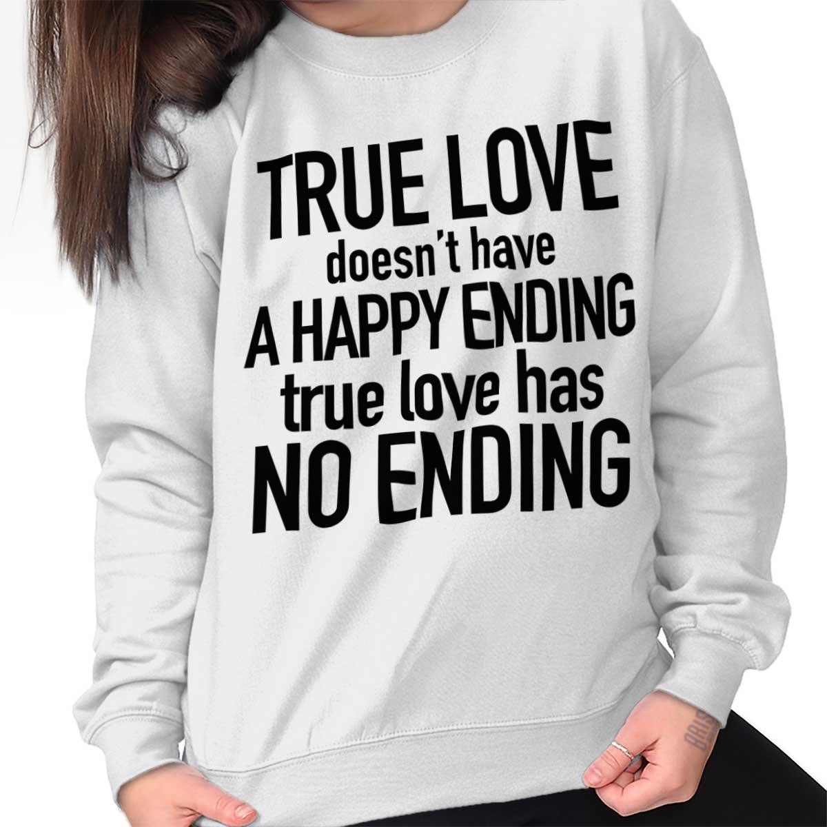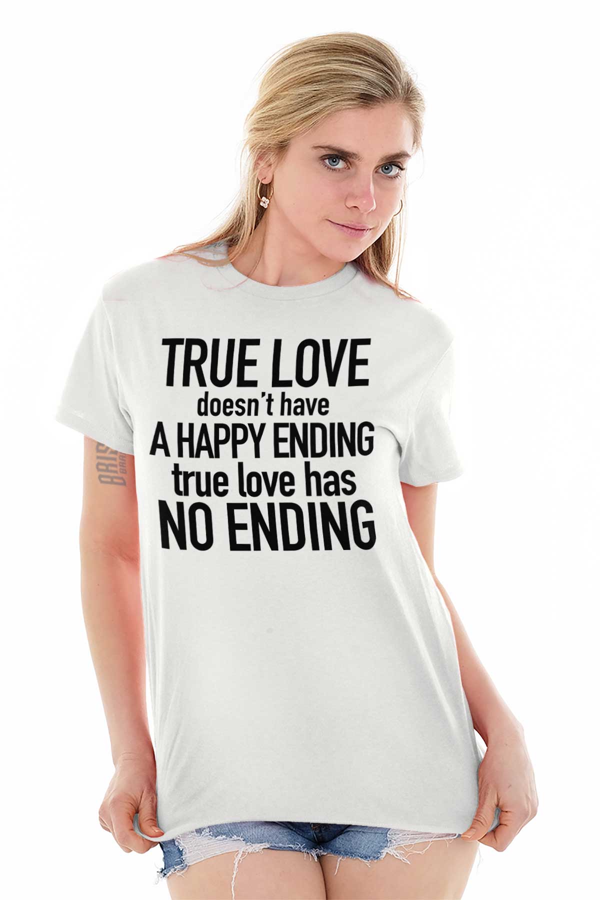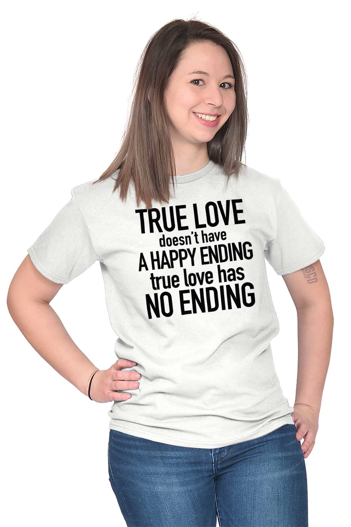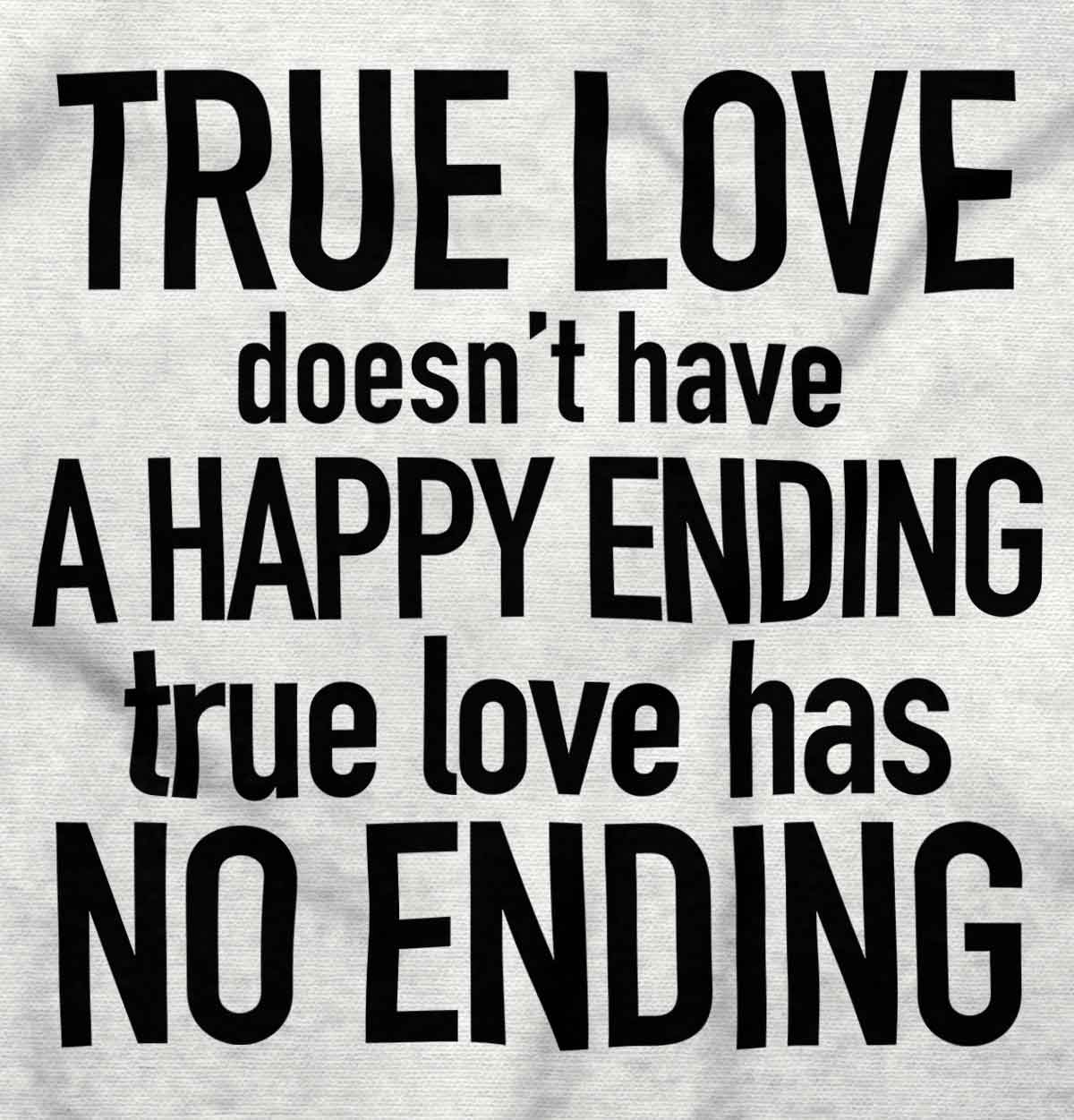 Words are powerful. Through words, we can inspire and motivate. Thus we are usually driven by emotion. Love – the emotion has inspired many great wordsmiths to pen classic works of art. Stories, poems, songs: they all have been written to celebrate the tender sentiment. They all conclude in some form or fashion and it is not always the ‘happily ever after’ we dream of. But that is where even these masters of expression get it wrong. Celebrate the emotion of love with this cute T Shirt: “True love doesn’t have a happy ending. True love has no ending.”