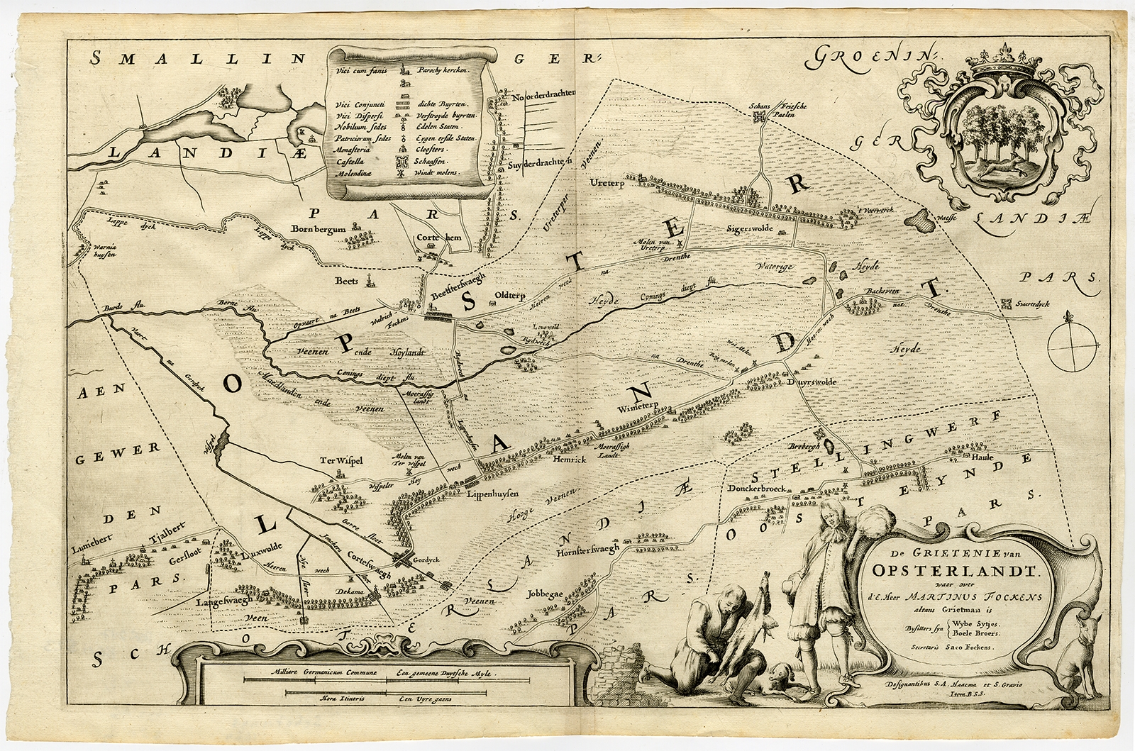 Antique Map of the region of Opsterland by Schotanus (1664) $ 317.17 instead of Availability: in stock Condition : Good, given age. Edge with an occasional tiny tear. A few minor light creases. Original folds as issued. General age-related toning and/or occasional minor defects from handling. Please study image carefully. Date : 1664 Overall size : 46.7 x 31 cm. Image size : 44.4 x 28.2 cm. Description: Antique map titled 'De Grietenie van Opsterlandt : waer over d'e. heer Martinus Fockens altans grietman is, bysitters syn Wybe Sytjes, Boele Broers, secretaris Saco Fockens.' Detailed and decorative regional map of the Grietenij of Opsterland, Friesland, The Netherlands. Multiple cartouches, key and coat of arms. This antique map originates from 'Beschrijvinge ende nieuwe caerten van de Heerlyckheydt van Frieslandt (…)', by Schotanus a Sterringa, first published in 1664. |