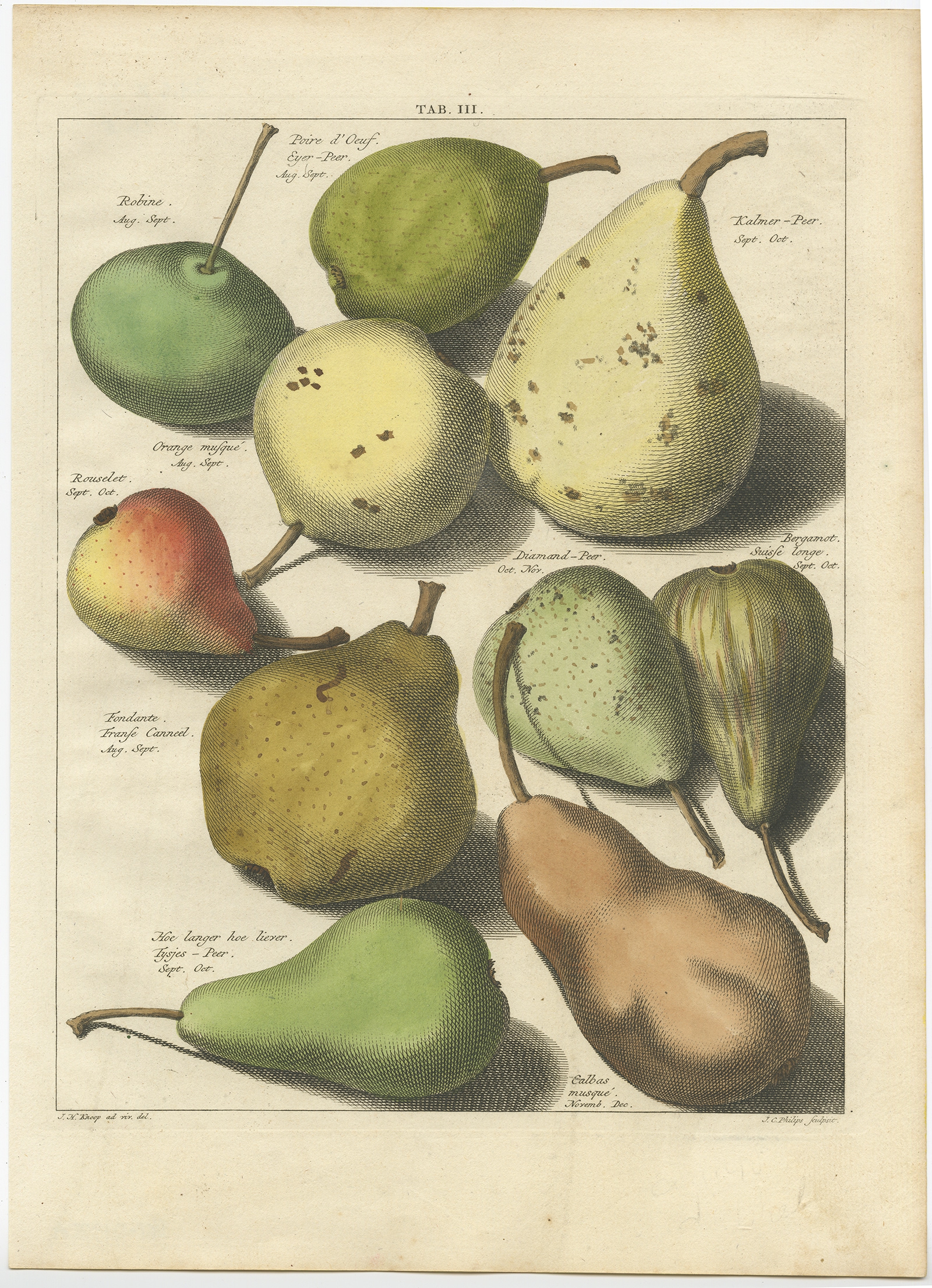 Tab. III Antique Print of various Pears by Knoop (1758) $ 231.26 Availability: in stock Condition : Very good, general age-related toning. Original/contemporary hand coloring. Please study image carefully. Date : 1758 Overall size : 24.5 x 33.5 cm. Image size : 21 x 26.5 cm. Description: Antique print depicting pear variaties including the Robine, Eyer-Peer, Kalmer-Peer, Rouselet, Orange Musque, Fondante Franse Canneel, Diamond Peer, Bergamot Suisse Longe, Hoe langer hoe liever Tijsjes Peer, Calbas Musquee. Originates from 'Pomologia' by J. H. Knoop. Artists and Engravers: Published by Johann Hermann Knoop (c.1700-1769). |