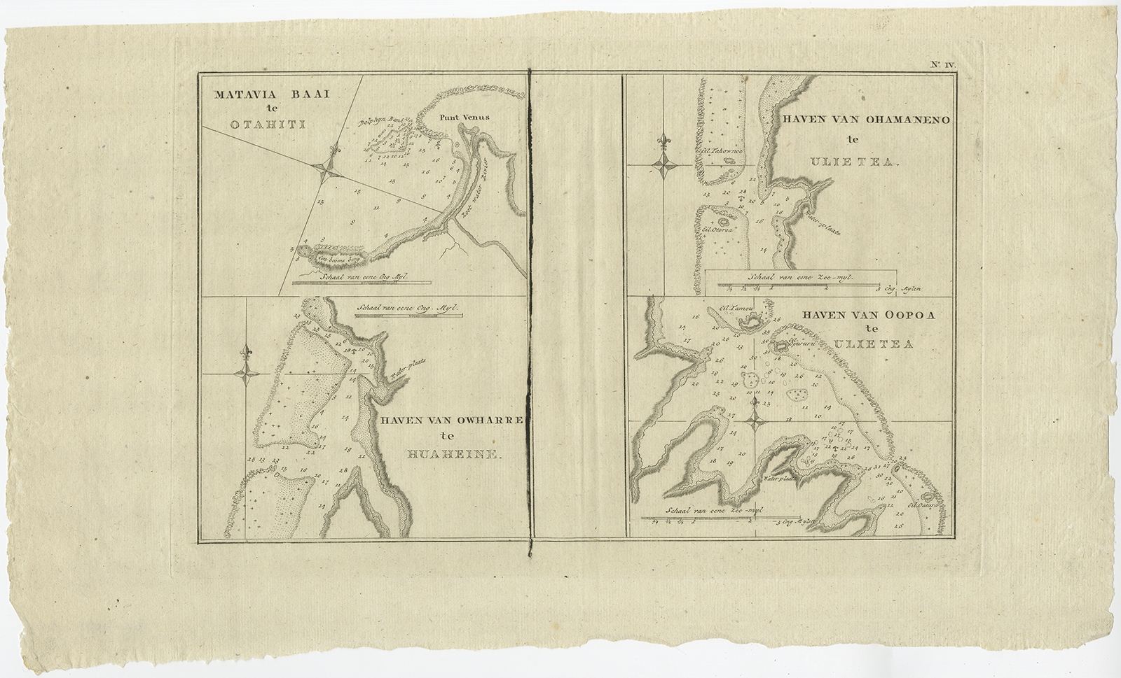 Antique Map of the Harbors of Matavai by Cook (1803) $ 328.94 instead of Availability: in stock Condition : Good, general age-related toning. Please study image carefully. Date : 1803 Overall size : 48 x 28 cm. Image size : 33 x 21 cm. Description: Antique map Oceania titled 'Matavia Baai te Otahiti (..)'. Antique map depicting the harbors of Matavai on the north coast of Tahiti; Ohamaneno and Oopoa on Raiatea (Ulieta on the chart) and Owharre on the island of Huahine. Originates from 'Reizen Rondom de Waereld door James Cook (..)'. Artists and Engravers: Translated by J.D. Pasteur. Published by Honkoop, Allart en Van Cleef. |