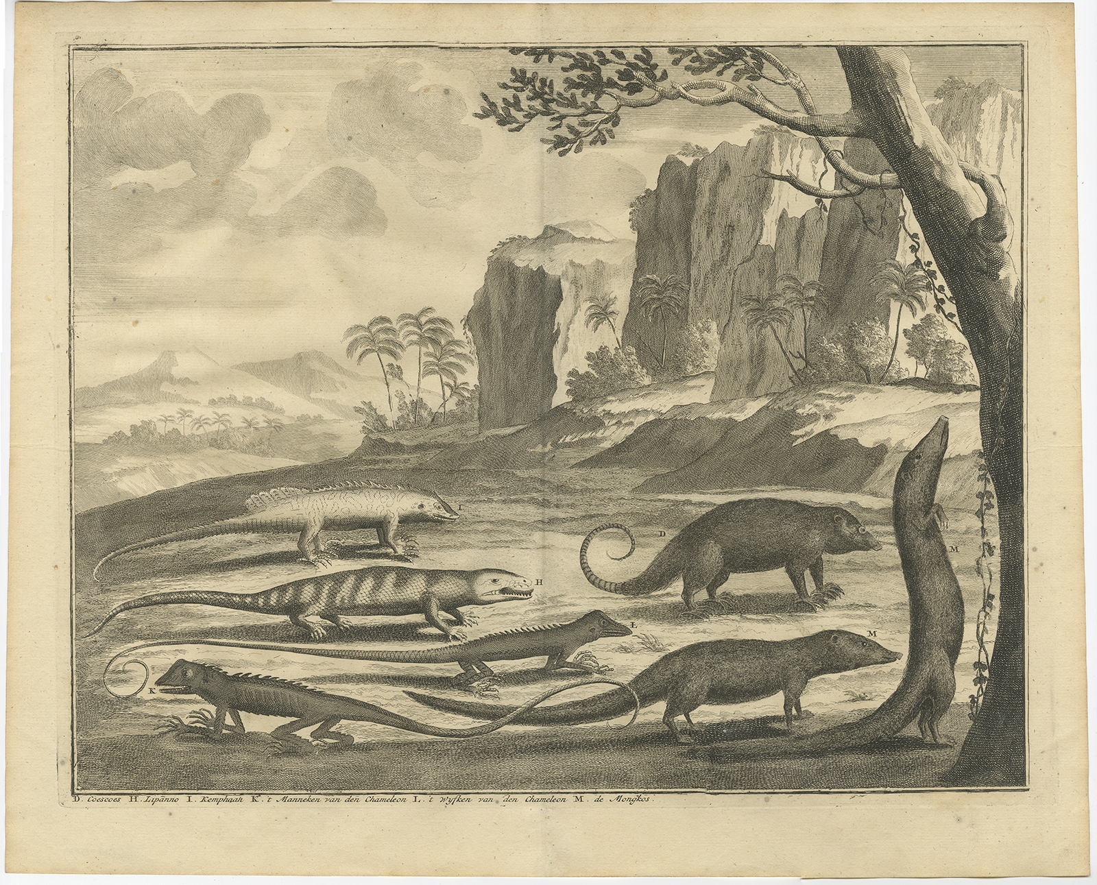 Coescoes, Lipanno, Kemphaan (..) - Valentijn (1726) $ 156.98 Availability: in stock Condition : Very good, general age-related toning. Please study image carefully. Date : 1726 Overall size : 40 x 34 cm. Image size : 37 x 29 cm. Description: Antique print depicting a a Cuscus, Lipanno, Kemphaan, Mongoose and Chameleon (male and female). This print originates from 'Oud en Nieuw Oost-Indiën' by F. Valentijn. Artists and Engravers: François Valentijn (1666-1727), a missionary, worked at Amboina from 1684 to 1694 and 1705 to 1713 and travelled extensively in the VOC's lands. |