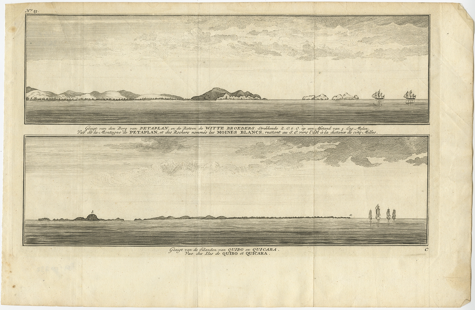 Antique Print of Petatlan and Coiba Island by Anson (1749) $ 164.18 Availability: in stock Condition : Fair, general age-related toning. Tape on upper corners. Minor defects and some creasing, please study image carefully. Date : 1749 Overall size : 41.5 x 27 cm. Image size : 36 x 21 cm. Description: Antique print titled 'Vue de la Montagne de Petaplan, et des rochers nommés les Moines Blancs, restant au S.E.vers l'est a la distance de cinq milles' and Vue des Iles de Quibo et Quicara.' View of the Petatlan Mountain, Barra de Potosí, and the White Monks' Rocks [with] View of the Islands of Coiba & Quicara. Petatlan, Mexico, and Coiba island, Panama. This print originates from 'Reize rondsom de Werreld (..)' by George Anson, published 1749. Artists and Engravers: Admiral of the Fleet George Anson, 1st Baron Anson, PC, FRS (23 April 1697 – 6 June 1762) was a Royal Navy officer. |