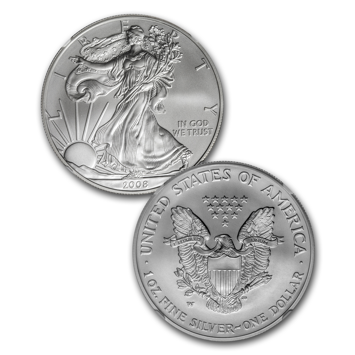 - Though the mint switched reverse dies for the Silver Eagle in 2008, an estimated 47,000 burnished coins were accidentally minted using the old 2007 dies. Most easily discernible by the use of a different U in United on the reverse, this is one of those coins.