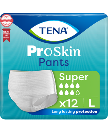 Tena Proskin Super pants provide discreet protection for moderate bladder leaks. With their skin fit and cotton-like fabric, they feel just like regular underwear for all-day comfort. Each pack contains 12 absorbent pants with channelized cores that guide leaks towards the absorbent zones to help keep skin dry. The soft non-woven topsheet feels gentle against skin while the pants stay securely in place. Their super absorbency is perfect for active days or periods of heavy flow. Discreet, skin-friendly protection you'll forget you're wearing - that's the power of Tena Proskin Super pants.