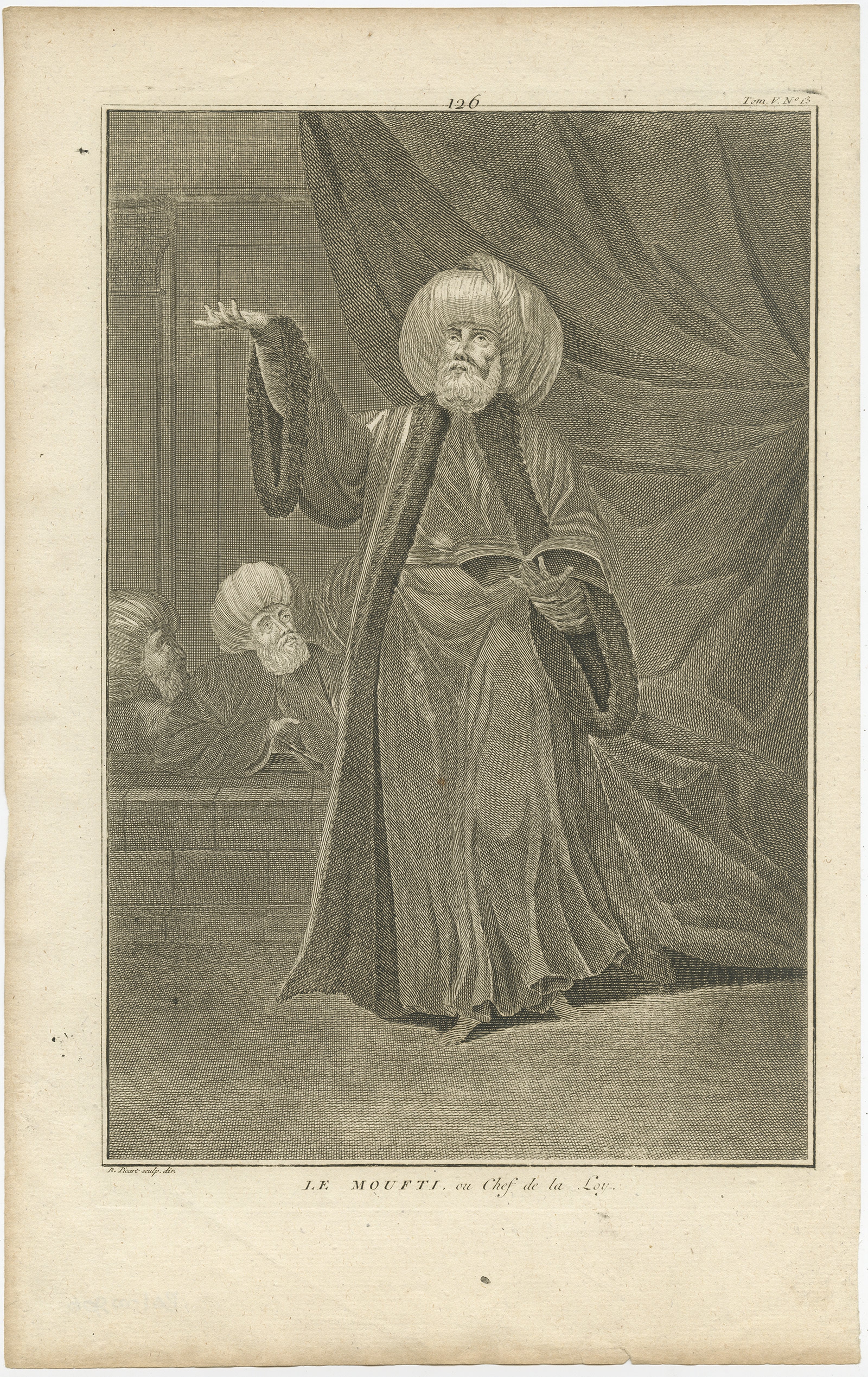 Le Moufti, ou Chef de la Loy - Picart (c.1725) $ 145.48 Availability: in stock Condition : Good, slightly faded. Please study image carefully. Date : c.1725 Overall size : 25 x 40 cm. Image size : 20.5 x 31 cm. Description: Antique portrait titled 'Le Moufti, ou Chef de la Loy'. Old print of the Mufti or Chief of the Law. A mufti is a Sunni Islamic scholar who is an interpreter or expounder of Islamic law (Sharia). This print originates from 'Ceremonies et costumes Religieuses (..)' by A. Moubach. Artists and Engravers: Bernard Picart (1673-1733), a French painter and engraver. |