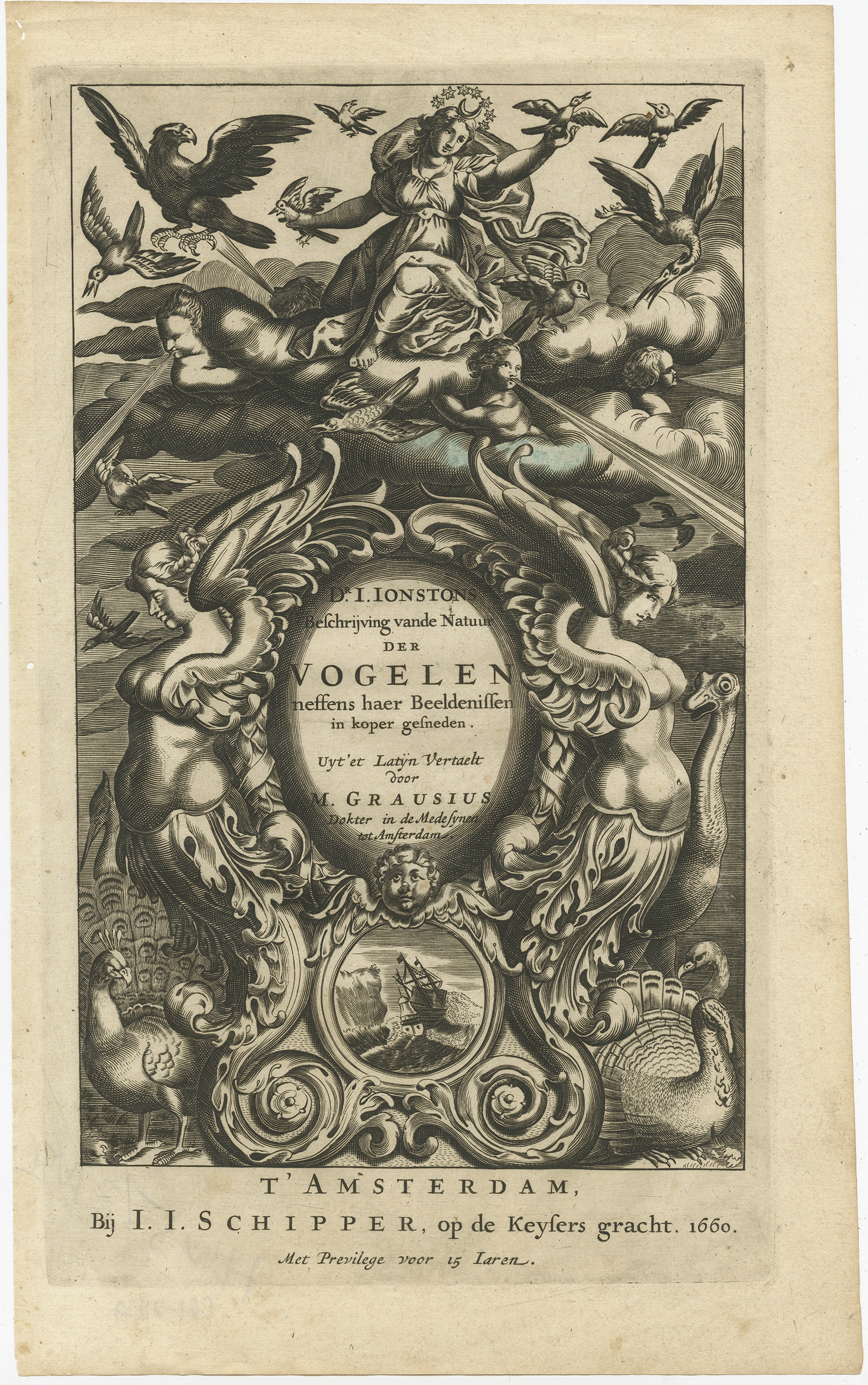 Beschryving van de Natuur der Vogelen - Merian (1660) $ 171.93 Availability: in stock Condition : Good, few marginal tears. Small wormhole outside image, part of cloud colored blue. Please study image carefully. Date : 1660 Overall size : 21 x 34.5 cm. Image size : 17 x 30 cm. Description: Antique frontispiece titled 'Dr. I. Ionstons Beschryving van de Natuur der Vogelen neffens haer Beeldenissen in koper gesneden'. Frontispiece of the Dutch edition of 'Historiae Naturalis de Avibus' translated from Latin to Dutch by M. Grausius, published by Schipper, Amsterdam, 1660 ( with plates by Merian). Artists and Engravers: Matthaus II Merian (1621-1687) was a leading German engraver of the day, from a prominent family of engravers and artists, and the father of Maria Merian. John Johnston (or Johnstone, 1603-1675) was a descendant of a Scottish family. Born in Sambter, Poland, he studied extensively at the famous universities of the day, including St. Andrews, Scotland, Cambridge & Leiden. After many years traveling in Europe, he settled in Silesia. Matthaus Merian was a leading German engraver of the day, from a prominent family of engravers and artists, and the father of Maria Merian. |