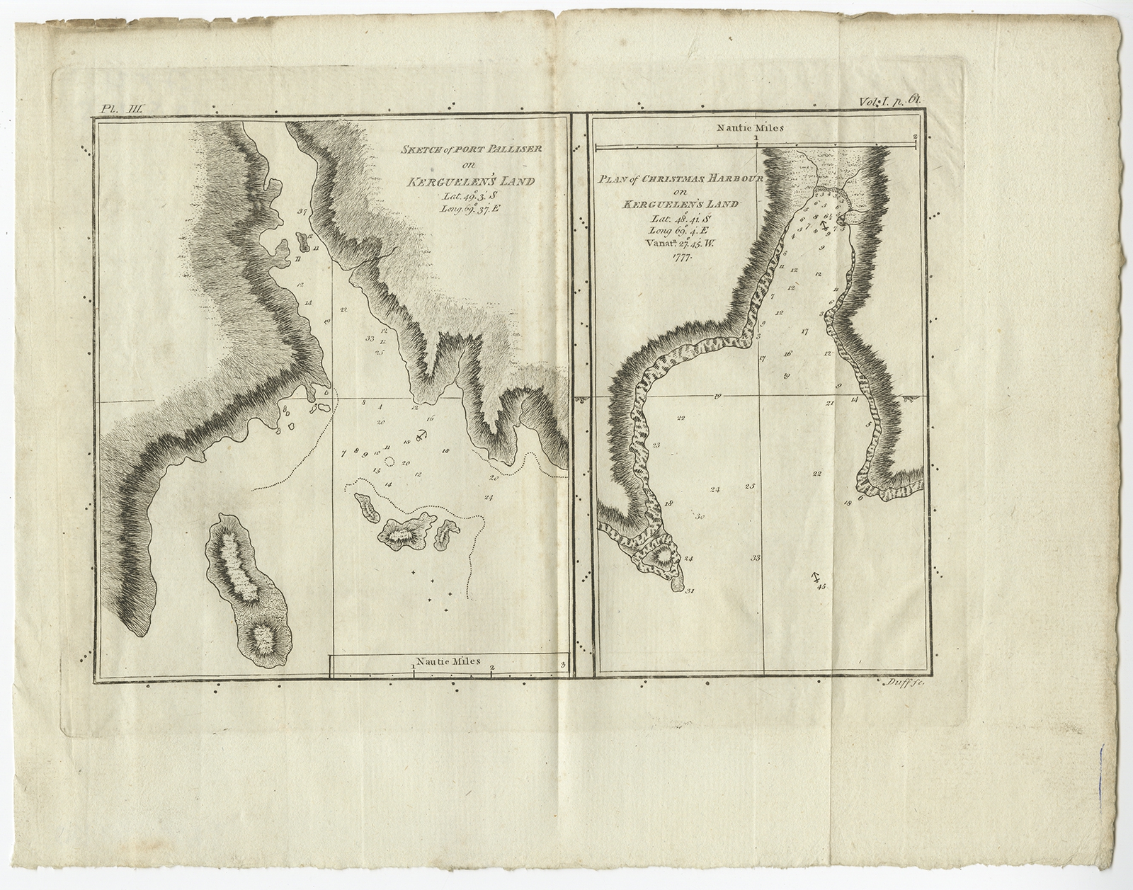 Antique Map of Port Pallisers & Kersmis by Cook (c.1781) $ 163.00 Availability: in stock Condition : Good, some wear and age-related toning. Please study image carefully. Date : c.1781 Overall size : 27 x 21 cm. Image size : 20.5 x 14.5 cm. Description: Antique map Kerguelen titled 'Sketch of Port Palliser on Kerguelen's Land (..)'. Antique map of Port Pallisers & Kersmis, Kerguelen or Desolation Islands. Originates from an edition of Cook's Voyages. Artists and Engravers: Engraved by Duff. |
